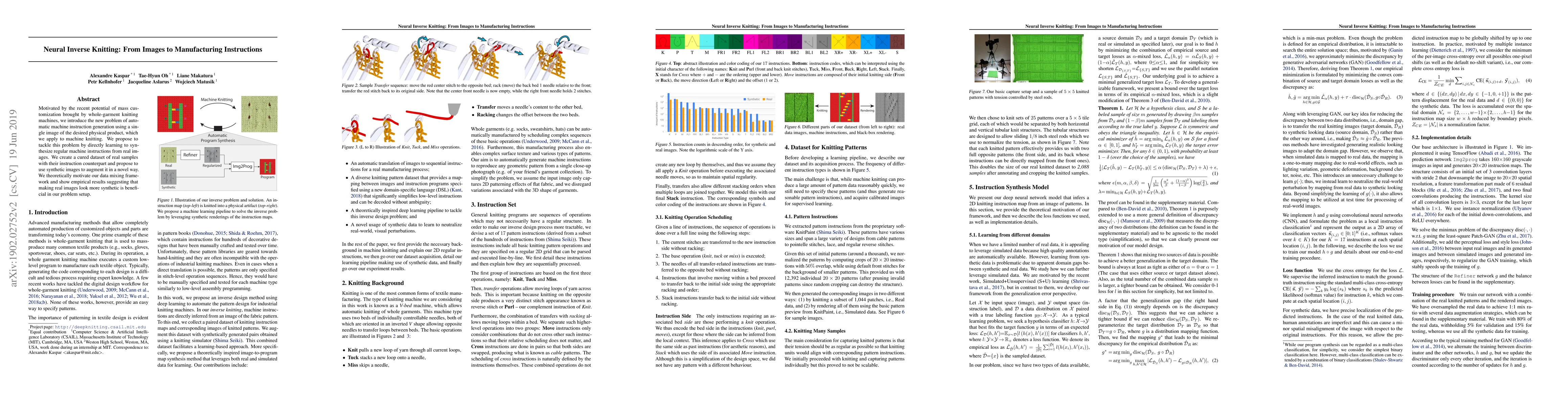Motivated by the recent potential of mass customization brought by whole-garment knitting machines, we introduce the new problem of automatic machine instruction generation using a single image of the desired physical product, which we apply to machine knitting. We propose to tackle this problem by directly learning to synthesize regular machine instructions from real images. We create a cured dataset of real samples with their instruction counterpart and propose to use synthetic images to augment it in a novel way. We theoretically motivate our data mixing framework and show empirical results suggesting that making real images look more synthetic is beneficial in our problem setup.