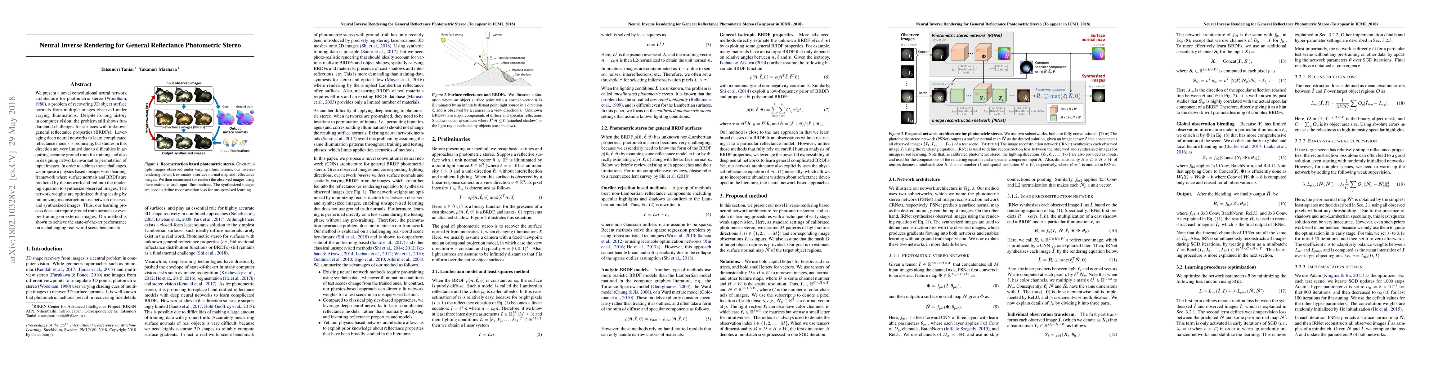 This paper introduces a novel neural network for general reflectance photometric stereo, addressing the challenge of recovering 3D surface normals without requiring ground truth data. The proposed physics-based unsupervised learning framework synthesizes images to optimize network weights, achieving state-of-the-art performance.