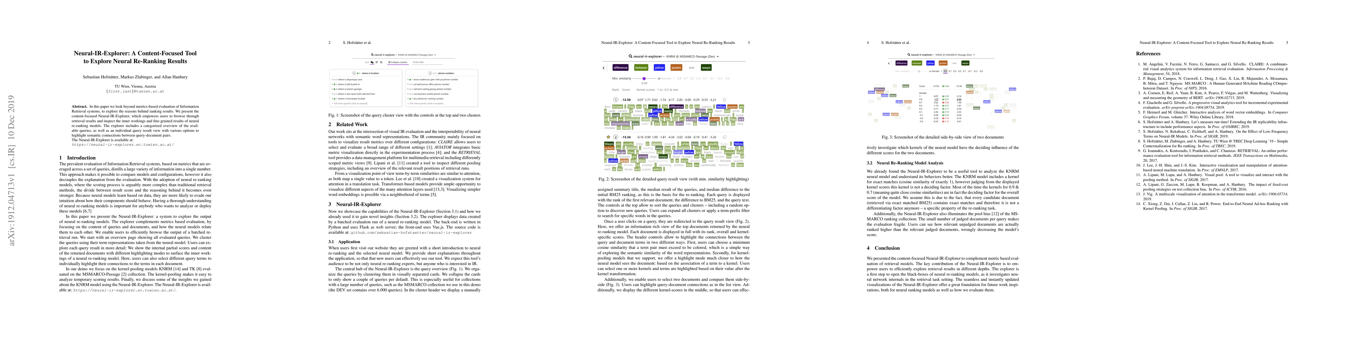 In this paper we look beyond metrics-based evaluation of Information Retrieval systems, to explore the reasons behind ranking results. We present the content-focused Neural-IR-Explorer, which empowers users to browse through retrieval results and inspect the inner workings and fine-grained results of neural re-ranking models. The explorer includes a categorized overview of the available queries, as well as an individual query result view with various options to highlight semantic connections between query-document pairs. The Neural-IR-Explorer is available at: https://neural-ir-explorer.ec.tuwien.ac.at/