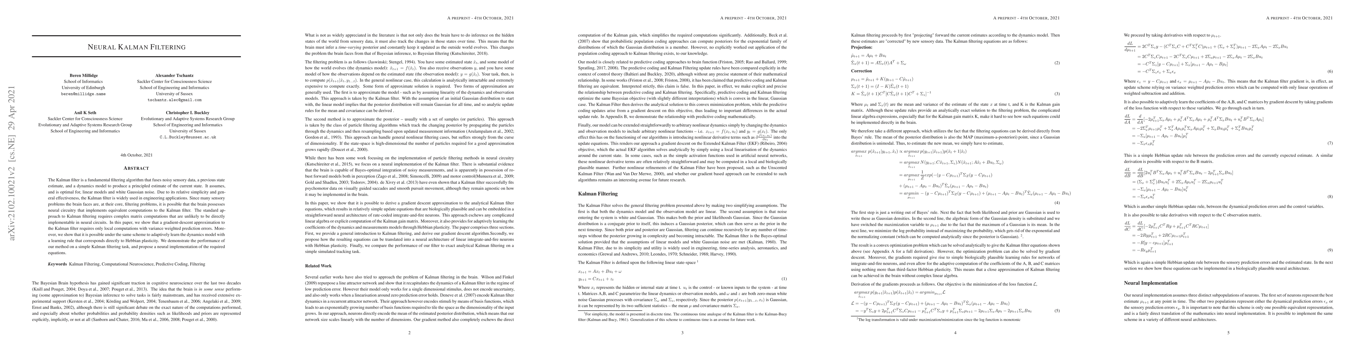 The Kalman filter is a fundamental filtering algorithm that fuses noisy sensory data, a previous state estimate, and a dynamics model to produce a principled estimate of the current state. It assumes, and is optimal for, linear models and white Gaussian noise. Due to its relative simplicity and general effectiveness, the Kalman filter is widely used in engineering applications. Since many sensory problems the brain faces are, at their core, filtering problems, it is possible that the brain possesses neural circuitry that implements equivalent computations to the Kalman filter. The standard approach to Kalman filtering requires complex matrix computations that are unlikely to be directly implementable in neural circuits. In this paper, we show that a gradient-descent approximation to the Kalman filter requires only local computations with variance weighted prediction errors. Moreover, we show that it is possible under the same scheme to adaptively learn the dynamics model with a learning rule that corresponds directly to Hebbian plasticity. We demonstrate the performance of our method on a simple Kalman filtering task, and propose a neural implementation of the required equations.