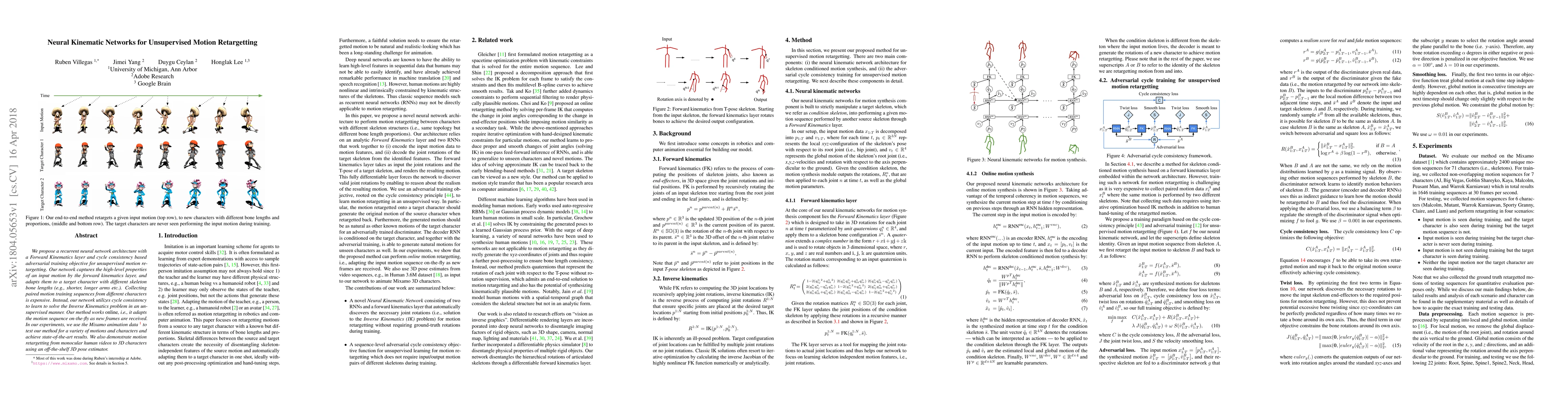 We propose a recurrent neural network architecture with a Forward Kinematics layer and cycle consistency based adversarial training objective for unsupervised motion retargetting. Our network captures the high-level properties of an input motion by the forward kinematics layer, and adapts them to a target character with different skeleton bone lengths (e.g., shorter, longer arms etc.). Collecting paired motion training sequences from different characters is expensive. Instead, our network utilizes cycle consistency to learn to solve the Inverse Kinematics problem in an unsupervised manner. Our method works online, i.e., it adapts the motion sequence on-the-fly as new frames are received. In our experiments, we use the Mixamo animation data to test our method for a variety of motions and characters and achieve state-of-the-art results. We also demonstrate motion retargetting from monocular human videos to 3D characters using an off-the-shelf 3D pose estimator.
