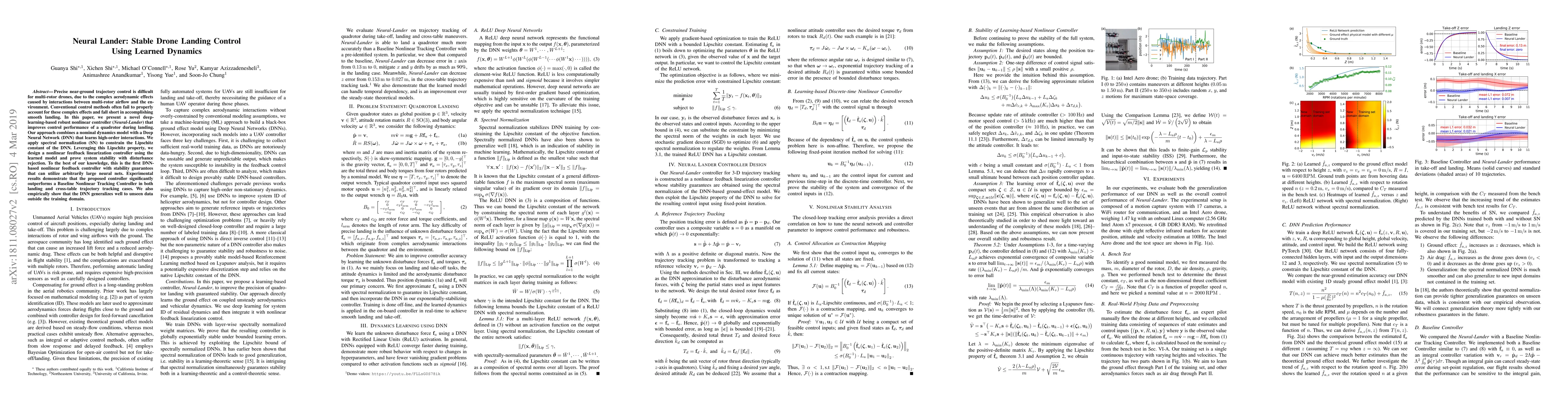 This paper introduces Neural Lander, a deep-learning-based controller that enhances quadrotor drone landing precision by learning complex dynamics and interactions. The approach combines a nominal dynamics model with a Deep Neural Network, applying spectral normalization for stability, and proves system stability with disturbance rejection. Experimental results show superior performance over conventional control methods.
