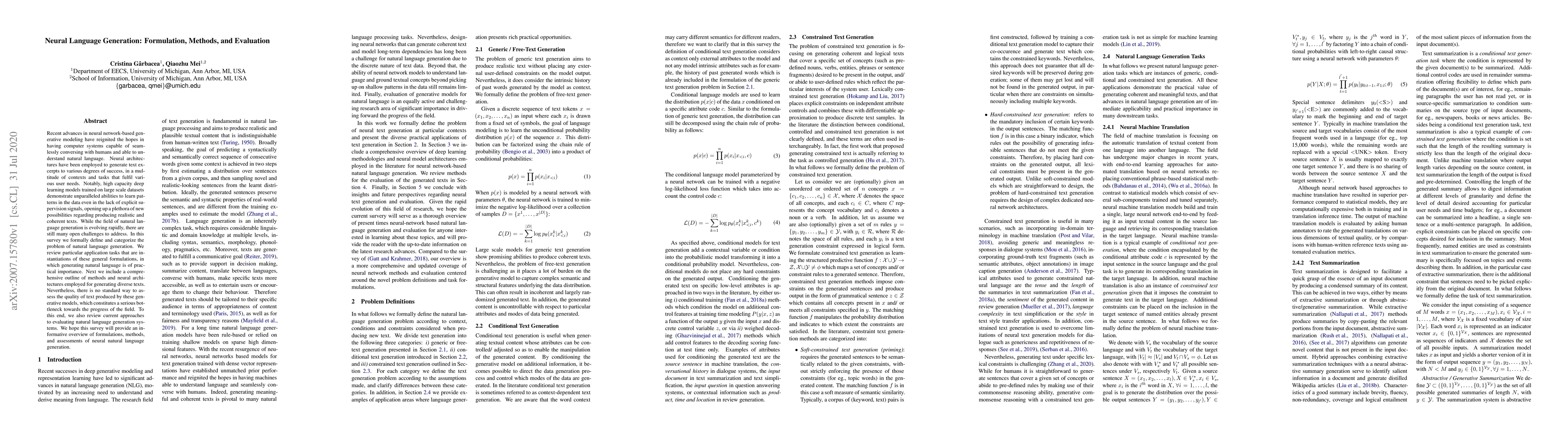 Recent advances in neural network-based generative modeling have reignited the hopes in having computer systems capable of seamlessly conversing with humans and able to understand natural language. Neural architectures have been employed to generate text excerpts to various degrees of success, in a multitude of contexts and tasks that fulfil various user needs. Notably, high capacity deep learning models trained on large scale datasets demonstrate unparalleled abilities to learn patterns in the data even in the lack of explicit supervision signals, opening up a plethora of new possibilities regarding producing realistic and coherent texts. While the field of natural language generation is evolving rapidly, there are still many open challenges to address. In this survey we formally define and categorize the problem of natural language generation. We review particular application tasks that are instantiations of these general formulations, in which generating natural language is of practical importance. Next we include a comprehensive outline of methods and neural architectures employed for generating diverse texts. Nevertheless, there is no standard way to assess the quality of text produced by these generative models, which constitutes a serious bottleneck towards the progress of the field. To this end, we also review current approaches to evaluating natural language generation systems. We hope this survey will provide an informative overview of formulations, methods, and assessments of neural natural language generation.
