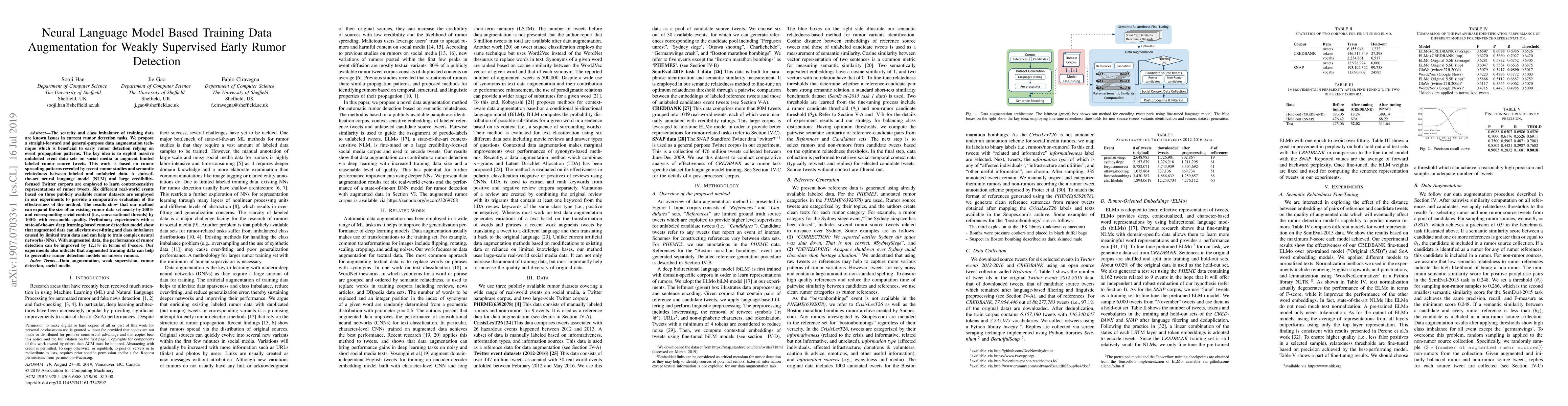This paper proposes a neural language model-based data augmentation technique to address the scarcity and class imbalance of training data in early rumor detection. By leveraging unlabeled social media data and rumor spreading patterns, the method expands existing rumor datasets and improves detection model performance by 12.1% in F-score, alleviating over-fitting and enhancing generalization.