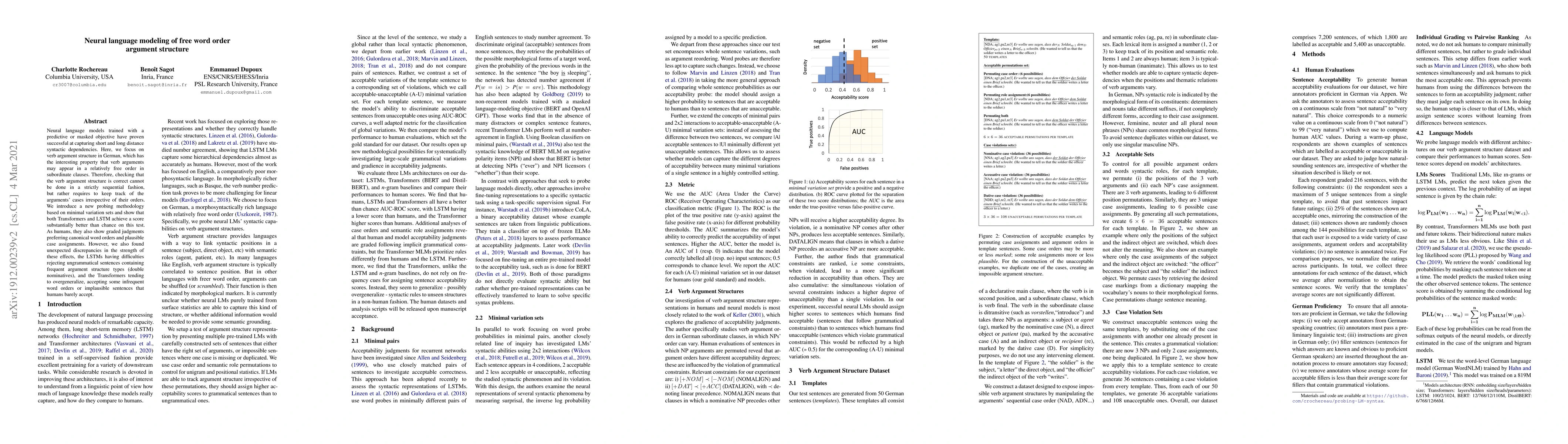 This research investigates neural language models' ability to understand German verb argument structures, where word order is flexible. The study introduces a probing methodology revealing that both Transformers and LSTMs perform better than chance, mimicking human preferences for canonical word orders, though with notable discrepancies in performance and error types.
