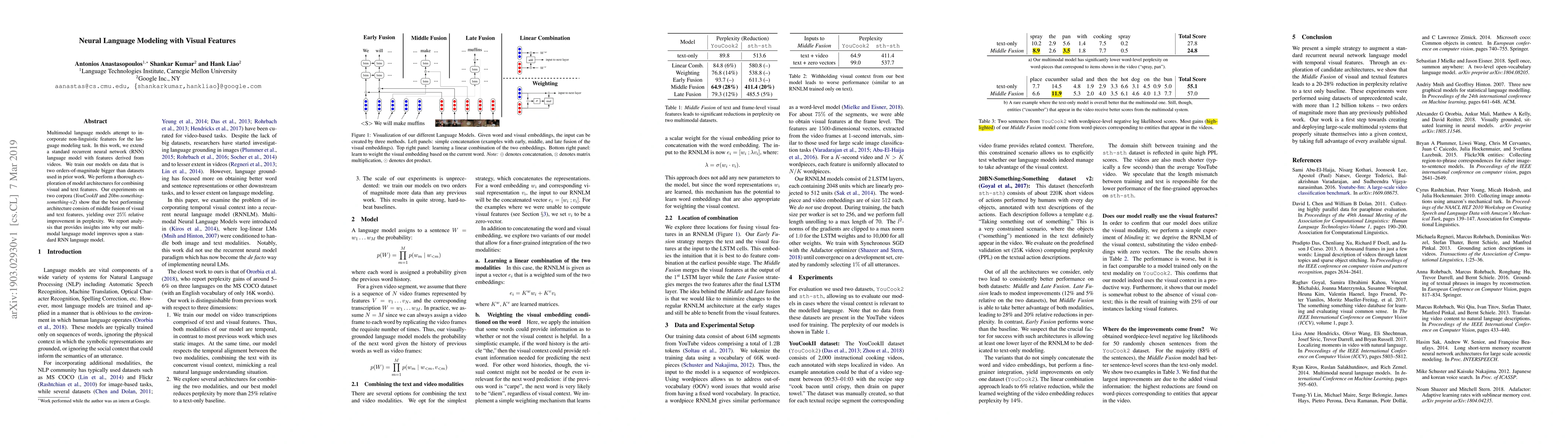 This paper extends a recurrent neural network language model with video features to create a multimodal language model, achieving a 25% relative improvement in perplexity by combining visual and text features through middle fusion. The study uses significantly larger datasets and explores various model architectures for optimal integration.