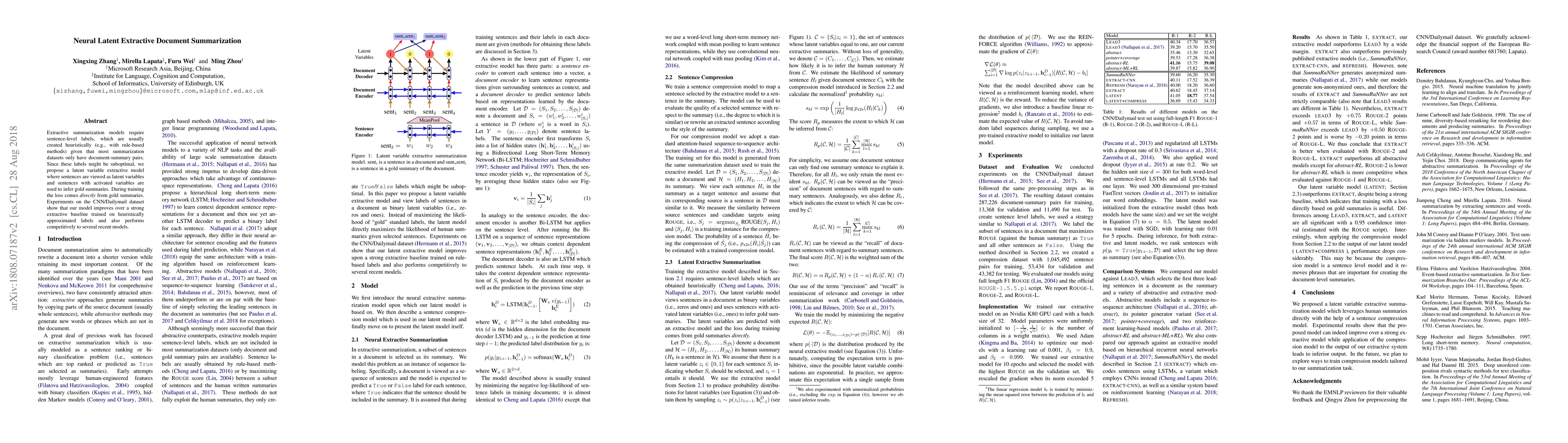 This paper proposes a neural latent variable extractive model for document summarization that infers optimal sentences from latent variables, improving upon heuristically labeled baselines and achieving competitive results on the CNN/Dailymail dataset. The model's training loss is directly derived from gold summaries, enhancing the summarization quality.