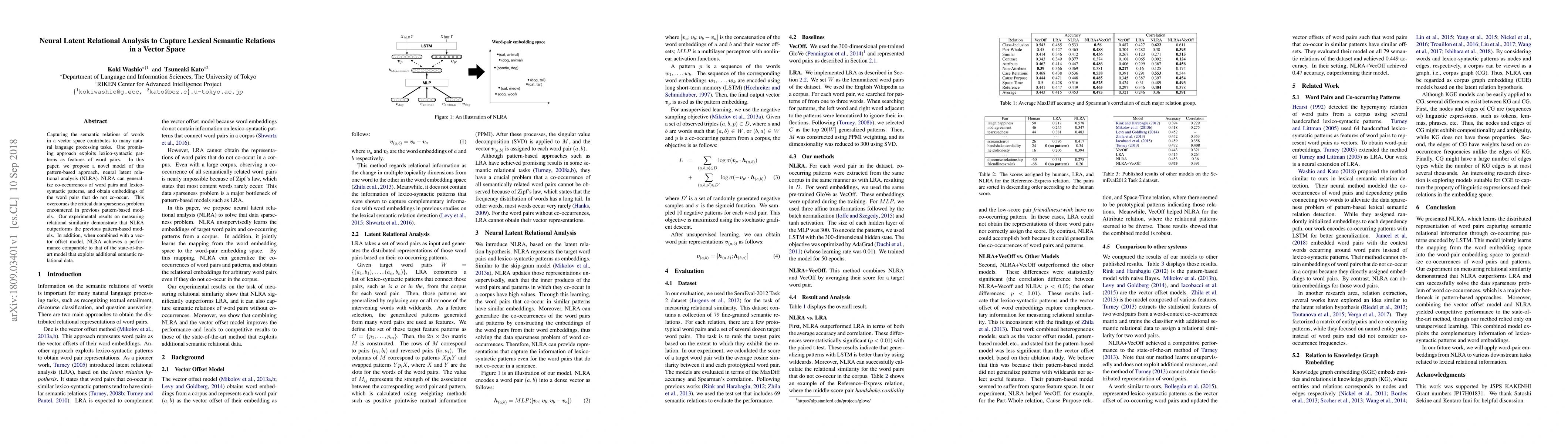 This paper introduces neural latent relational analysis (NLRA), a novel model that leverages lexico-syntactic patterns to capture semantic relations between words in a vector space, addressing data sparseness issues. Experimental results show NLRA outperforms previous models and achieves state-of-the-art performance when combined with a vector offset model.