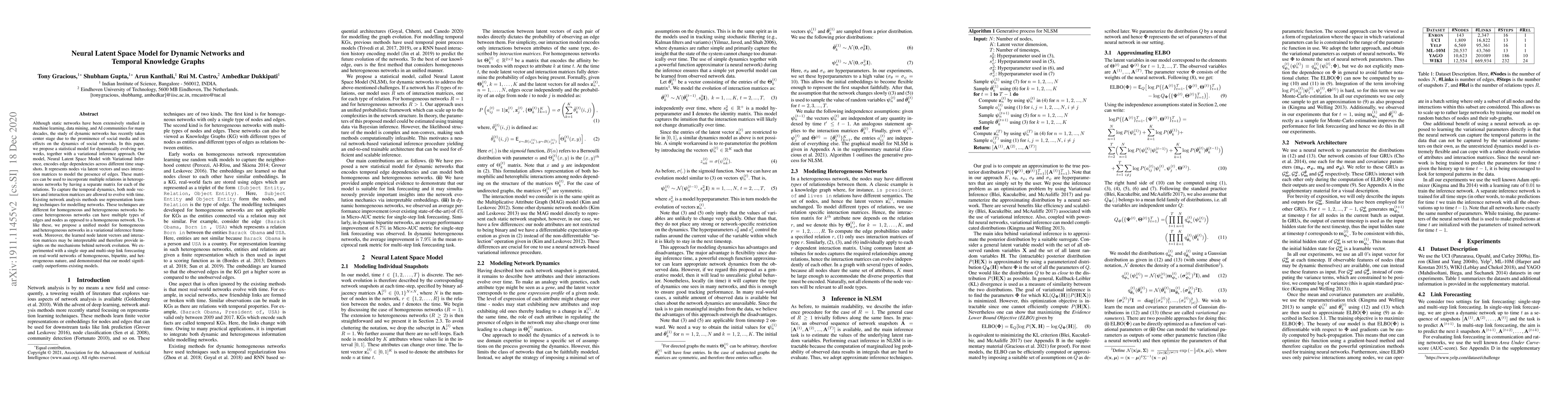 Although static networks have been extensively studied in machine learning, data mining, and AI communities for many decades, the study of dynamic networks has recently taken center stage due to the prominence of social media and its effects on the dynamics of social networks. In this paper, we propose a statistical model for dynamically evolving networks, together with a variational inference approach. Our model, Neural Latent Space Model with Variational Inference, encodes edge dependencies across different time snapshots. It represents nodes via latent vectors and uses interaction matrices to model the presence of edges. These matrices can be used to incorporate multiple relations in heterogeneous networks by having a separate matrix for each of the relations. To capture the temporal dynamics, both node vectors and interaction matrices are allowed to evolve with time. Existing network analysis methods use representation learning techniques for modelling networks. These techniques are different for homogeneous and heterogeneous networks because heterogeneous networks can have multiple types of edges and nodes as opposed to a homogeneous network. Unlike these, we propose a unified model for homogeneous and heterogeneous networks in a variational inference framework. Moreover, the learned node latent vectors and interaction matrices may be interpretable and therefore provide insights on the mechanisms behind network evolution. We experimented with a single step and multi-step link forecasting on real-world networks of homogeneous, bipartite, and heterogeneous nature, and demonstrated that our model significantly outperforms existing models.