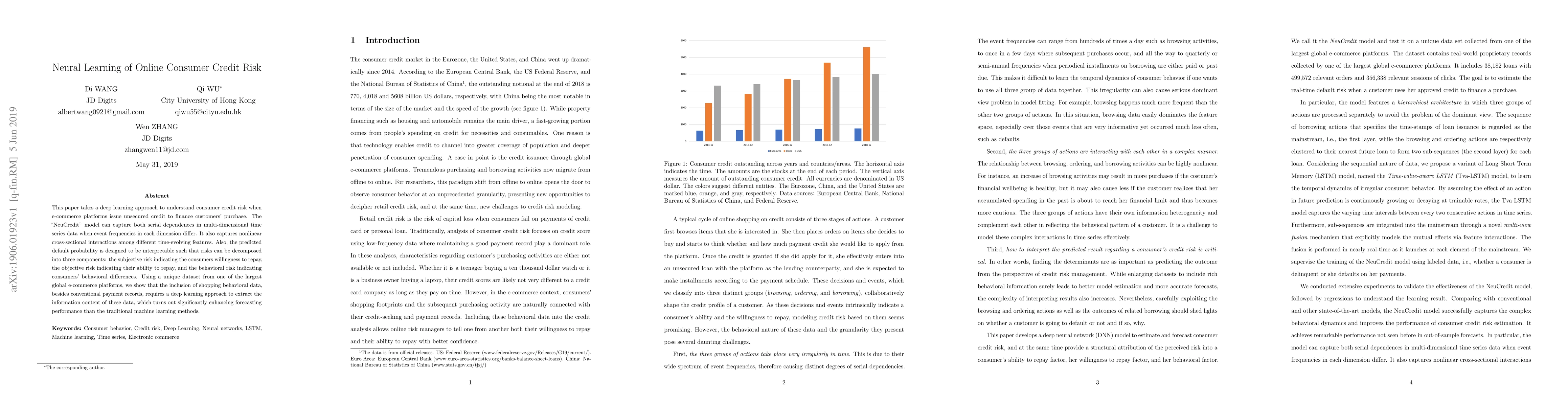 This paper introduces the "NeuCredit" deep learning model to assess consumer credit risk in e-commerce, capturing complex temporal dependencies and nonlinear interactions. It enhances forecasting performance by incorporating shopping behavioral data, decomposing default probability into subjective, objective, and behavioral risk components.