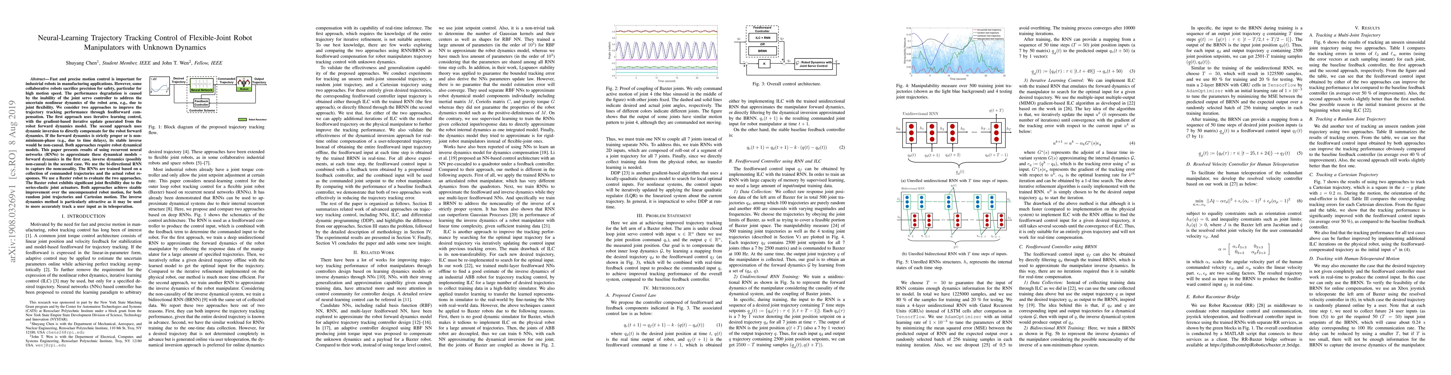 This paper proposes neural-learning methods to enhance trajectory tracking control for flexible-joint robot manipulators with unknown dynamics. It uses recurrent neural networks to approximate the robot's forward and inverse dynamics for iterative learning and dynamic inversion control, respectively, achieving significant improvements in motion precision over uncompensated control.