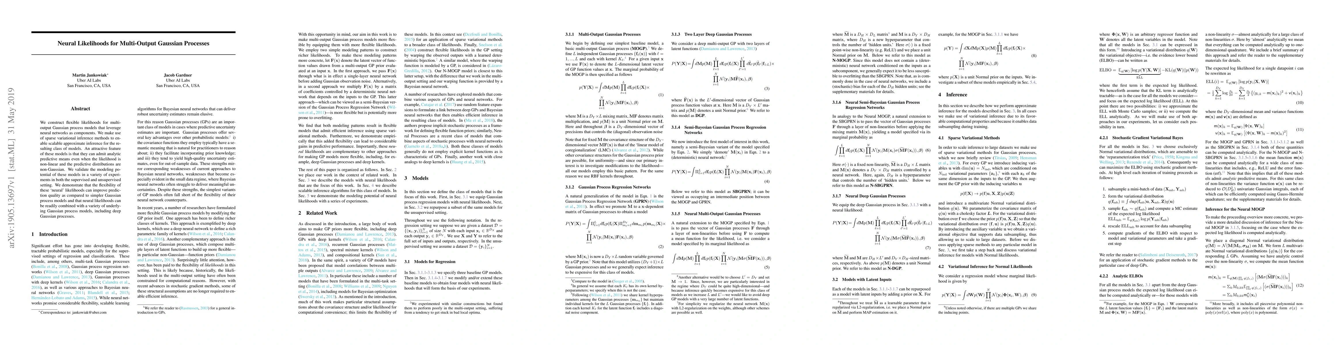 This paper introduces neural likelihoods for multi-output Gaussian processes, combining neural networks with sparse variational inference for scalable approximate inference. The proposed models demonstrate improved prediction quality over traditional Gaussian processes, especially in complex, non-linear scenarios.
