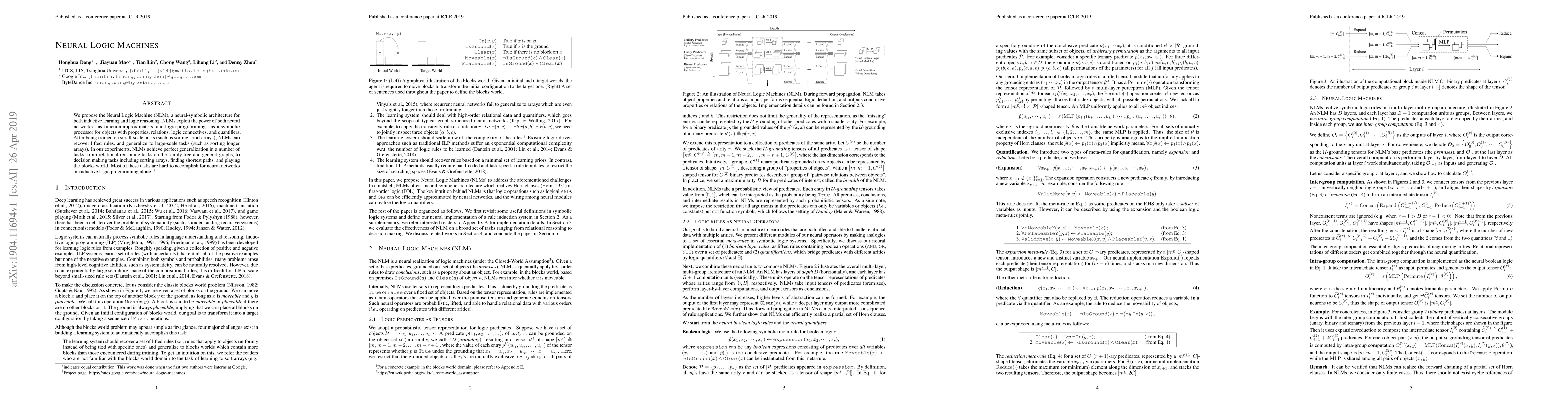 The Neural Logic Machine (NLM) combines neural networks and logic programming for inductive learning and reasoning, achieving perfect generalization in various tasks, from relational reasoning to decision making, outperforming both neural networks and inductive logic programming alone.