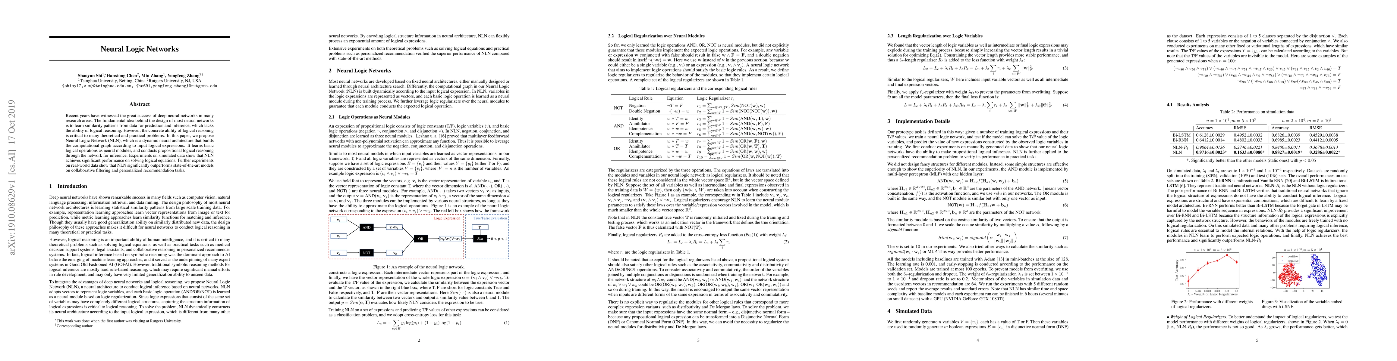 The paper proposes Neural Logic Networks (NLN), a dynamic neural architecture that integrates logical reasoning into deep learning. NLN learns basic logical operations and performs propositional reasoning, achieving superior performance on logical equation solving and outperforming state-of-the-art models in collaborative filtering and recommendation tasks.