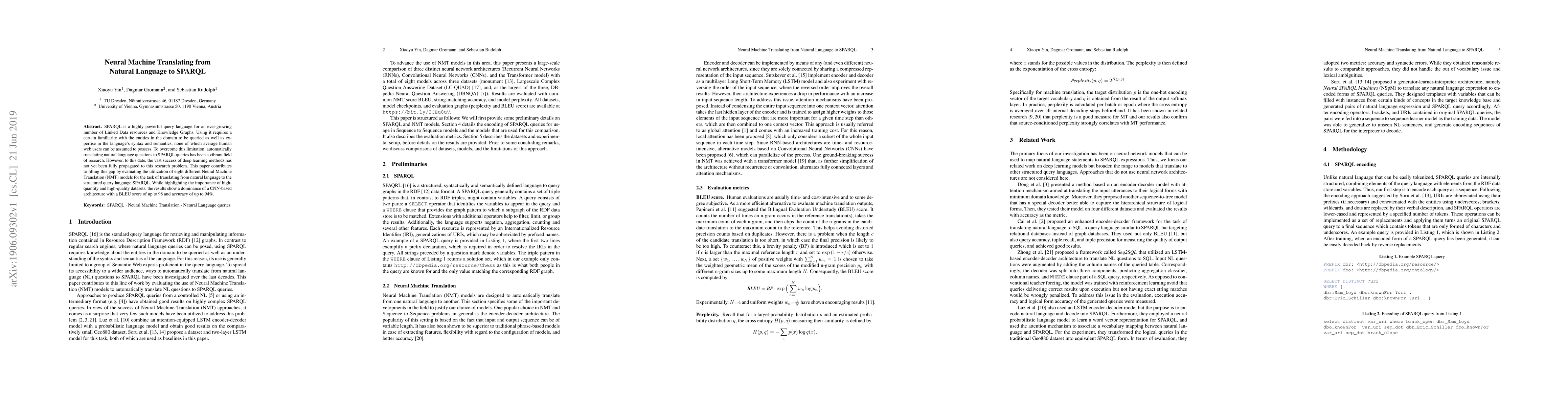 This paper evaluates eight Neural Machine Translation models to translate natural language questions into SPARQL queries, emphasizing the need for accessible query languages for non-experts. The study finds that a CNN-based architecture achieves the highest performance with a BLEU score of 98 and accuracy up to 94%.