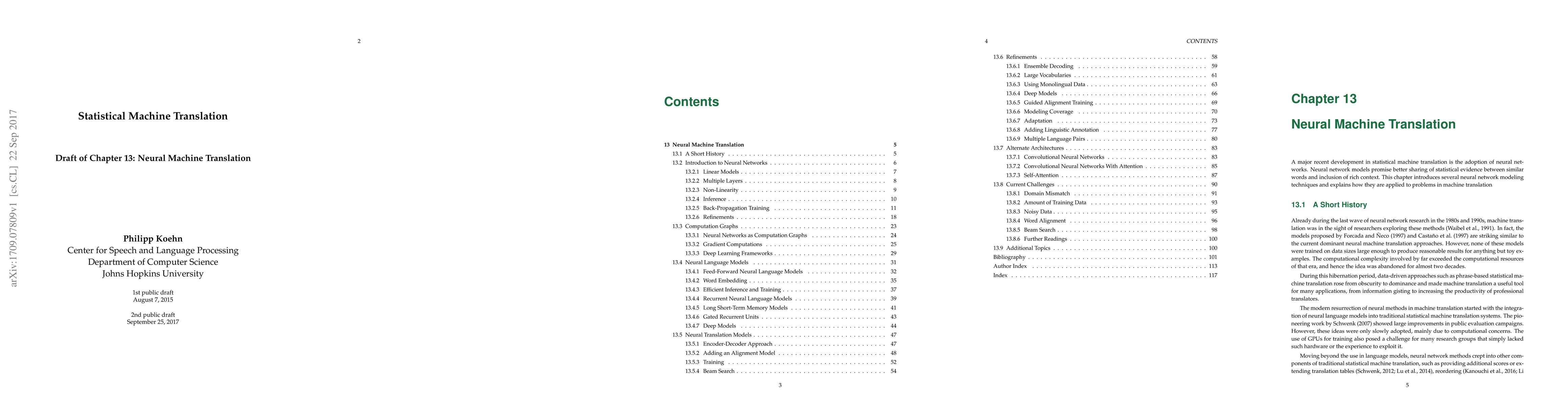 Draft of textbook chapter on neural machine translation. a comprehensive treatment of the topic, ranging from introduction to neural networks, computation graphs, description of the currently dominant attentional sequence-to-sequence model, recent refinements, alternative architectures and challenges. Written as chapter for the textbook Statistical Machine Translation. Used in the JHU Fall 2017 class on machine translation.