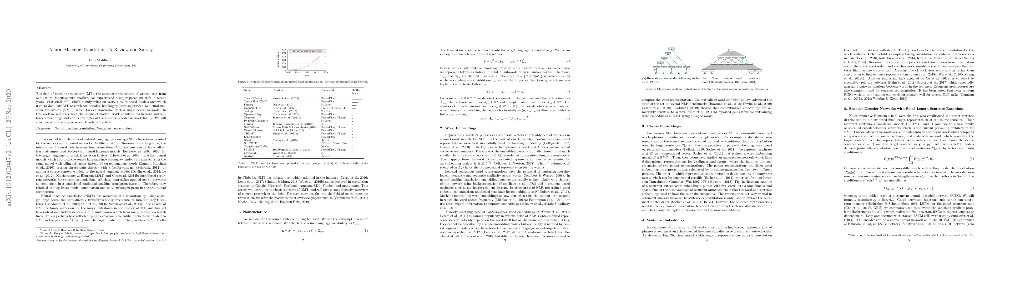 The field of machine translation (MT), the automatic translation of written text from one natural language into another, has experienced a major paradigm shift in recent years. Statistical MT, which mainly relies on various count-based models and which used to dominate MT research for decades, has largely been superseded by neural machine translation (NMT), which tackles translation with a single neural network. In this work we will trace back the origins of modern NMT architectures to word and sentence embeddings and earlier examples of the encoder-decoder network family. We will conclude with a survey of recent trends in the field.