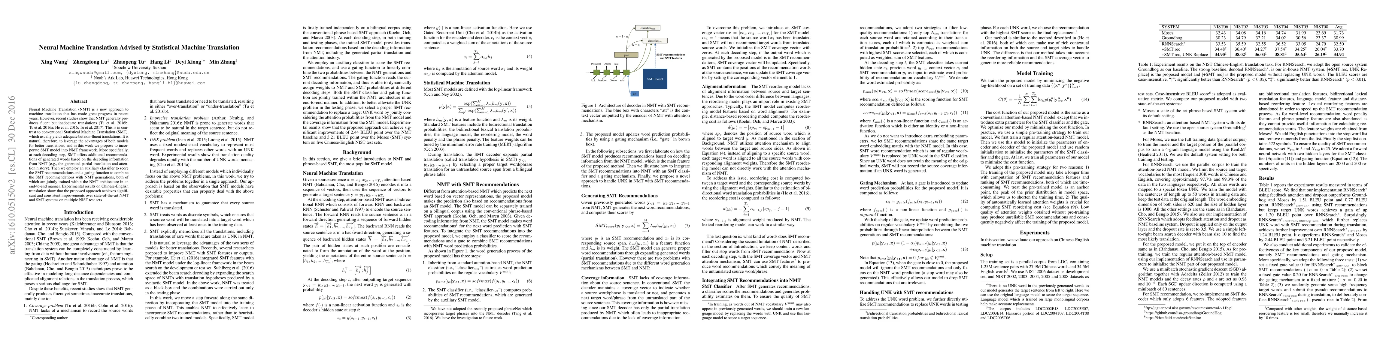 Neural Machine Translation (NMT) is a new approach to machine translation that has made great progress in recent years. However, recent studies show that NMT generally produces fluent but inadequate translations (Tu et al. 2016b; Tu et al. 2016a; He et al. 2016; Tu et al. 2017). This is in contrast to conventional Statistical Machine Translation (SMT), which usually yields adequate but non-fluent translations. It is natural, therefore, to leverage the advantages of both models for better translations, and in this work we propose to incorporate SMT model into NMT framework. More specifically, at each decoding step, SMT offers additional recommendations of generated words based on the decoding information from NMT (e.g., the generated partial translation and attention history). Then we employ an auxiliary classifier to score the SMT recommendations and a gating function to combine the SMT recommendations with NMT generations, both of which are jointly trained within the NMT architecture in an end-to-end manner. Experimental results on Chinese-English translation show that the proposed approach achieves significant and consistent improvements over state-of-the-art NMT and SMT systems on multiple NIST test sets.