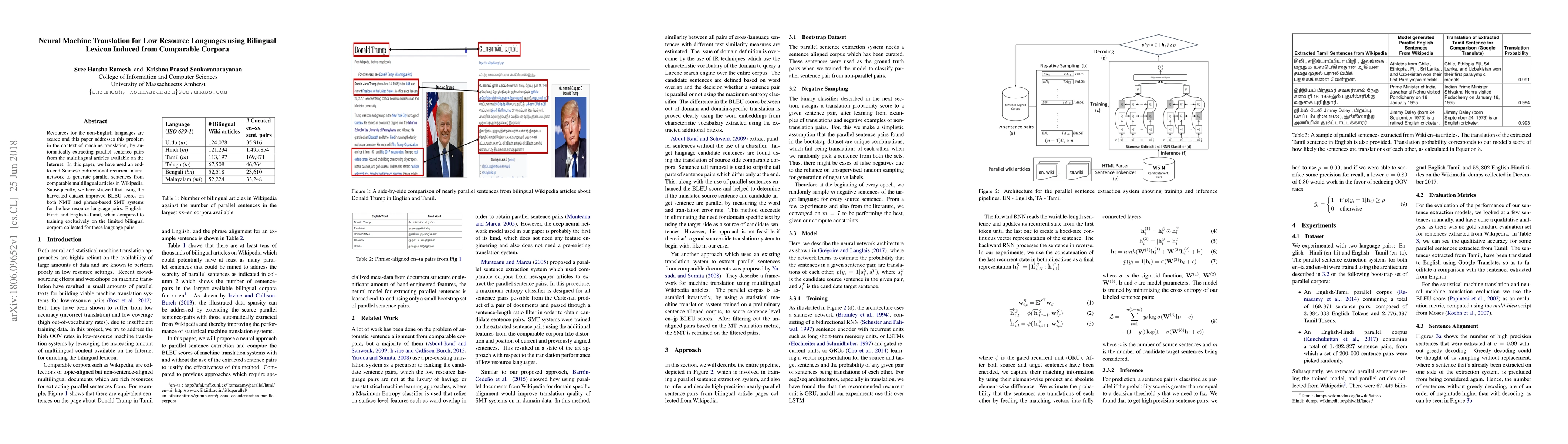 This paper proposes a method to enhance neural machine translation for low-resource languages by inducing bilingual lexicons from comparable corpora. It demonstrates that using extracted parallel sentences from multilingual Wikipedia articles improves translation quality for English-Hindi and English-Tamil pairs.
