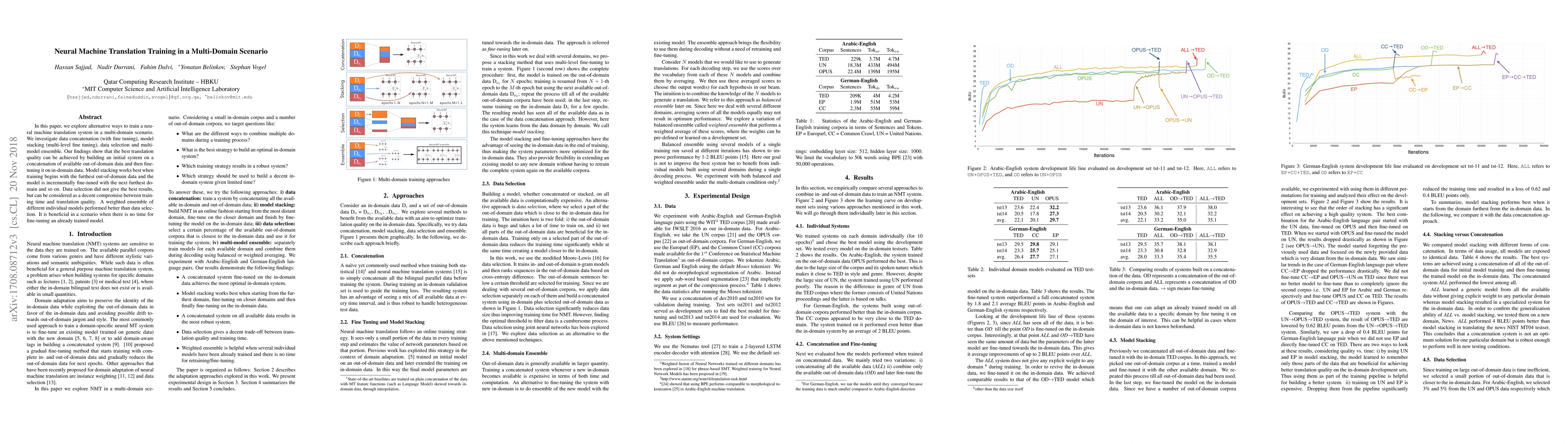 This paper investigates various training methods for neural machine translation in multi-domain scenarios, finding that concatenation followed by fine-tuning yields the best translation quality. Model stacking with incremental fine-tuning from out-to-in-domain data also performs well.