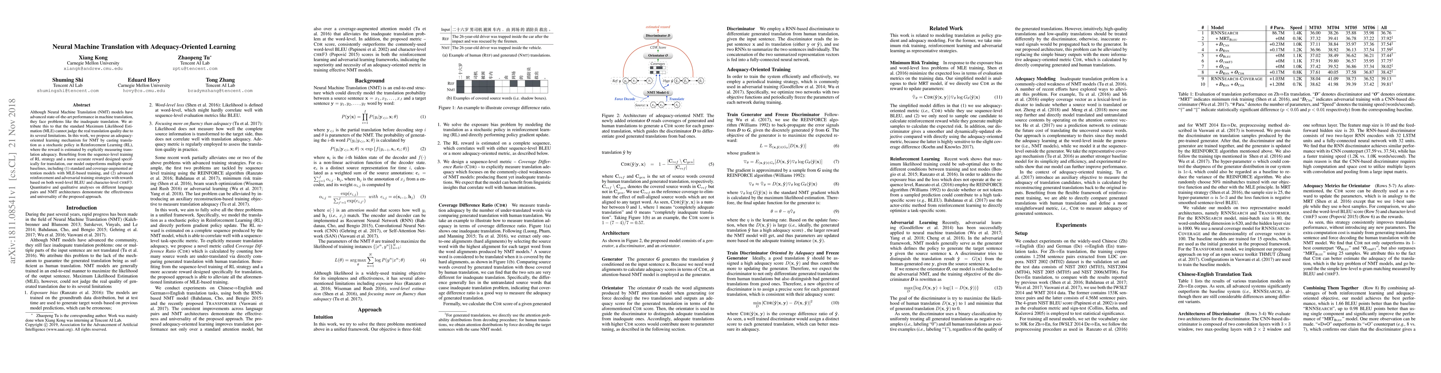 This paper proposes an adequacy-oriented learning mechanism for Neural Machine Translation using Reinforcement Learning, where translation adequacy is explicitly measured as a reward. The approach outperforms standard MLE-based models and other advanced training strategies, demonstrating improved translation quality across various language pairs and architectures.
