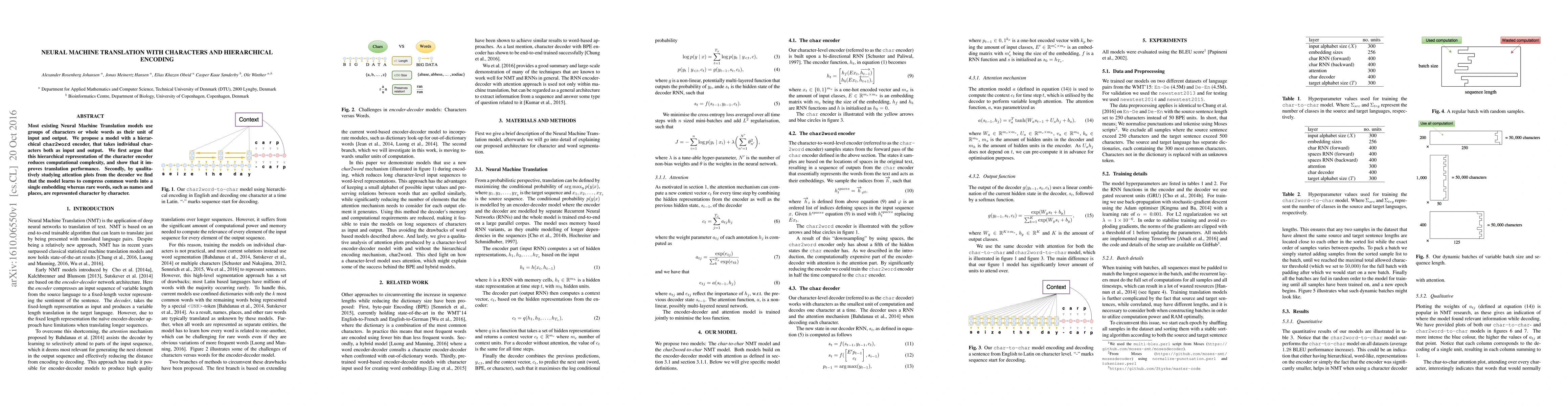 A new neural machine translation model uses a hierarchical character encoder to improve translation performance and reduce computational complexity. It learns to represent common words with single embeddings and rare words with character-by-character representations.