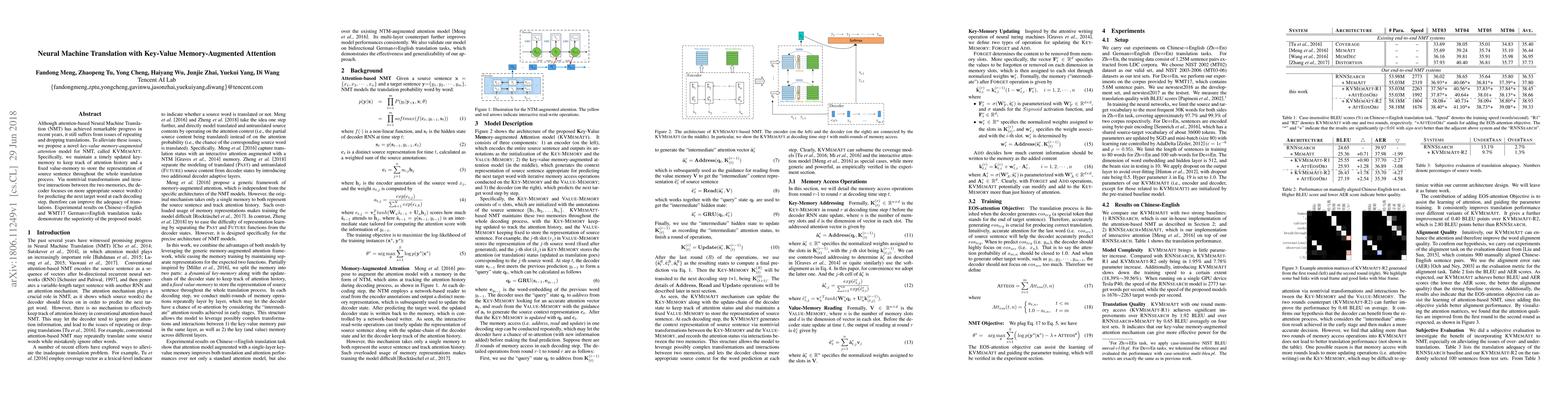 This paper proposes a key-value memory-augmented attention model, KVMEMATT, for Neural Machine Translation to address repetition and dropping issues. It uses a keymemory for attention history and a value-memory for source sentence representation, improving translation adequacy, as shown in experiments on Chinese=>English and German=>English tasks.
