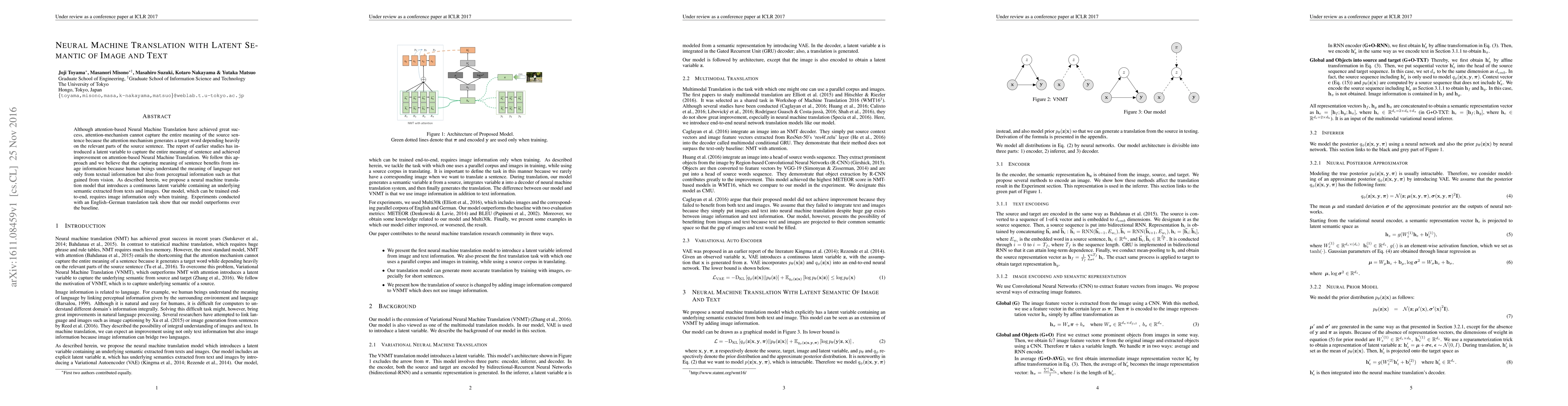 This paper proposes a neural machine translation model incorporating a continuous latent variable derived from both textual and visual information to capture the full meaning of sentences, improving translation quality. Experiments on an English-German translation task demonstrate that this approach outperforms traditional attention-based models.