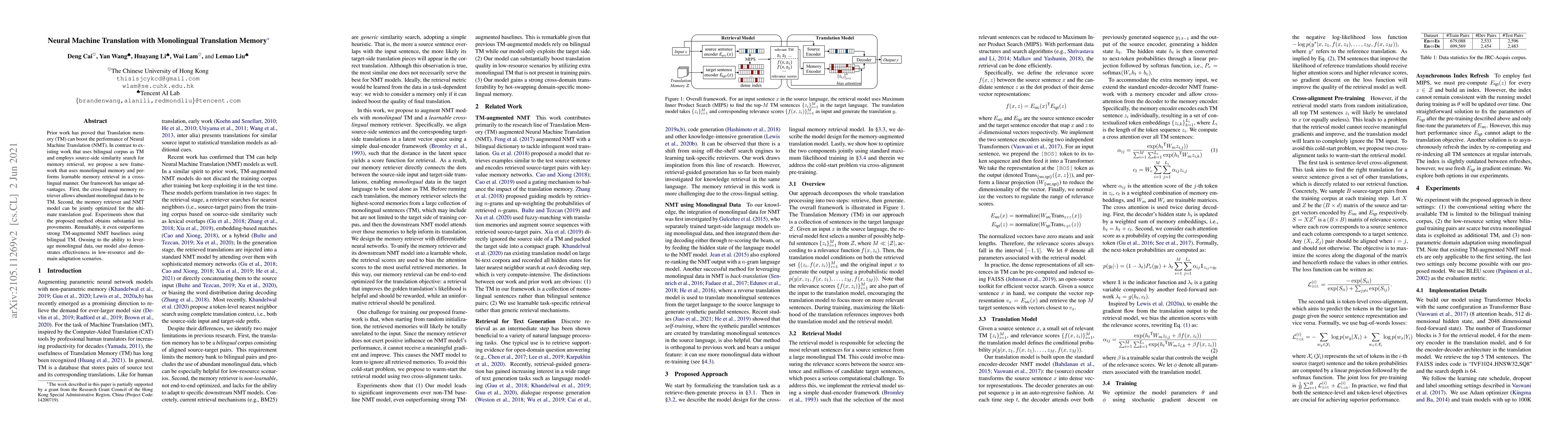 This paper proposes a novel framework for Neural Machine Translation (NMT) that leverages monolingual translation memory (TM) and learnable memory retrieval across languages, outperforming existing bilingual TM-augmented methods. The framework's cross-lingual retriever and joint optimization show significant improvements, especially in low-resource and domain adaptation contexts.