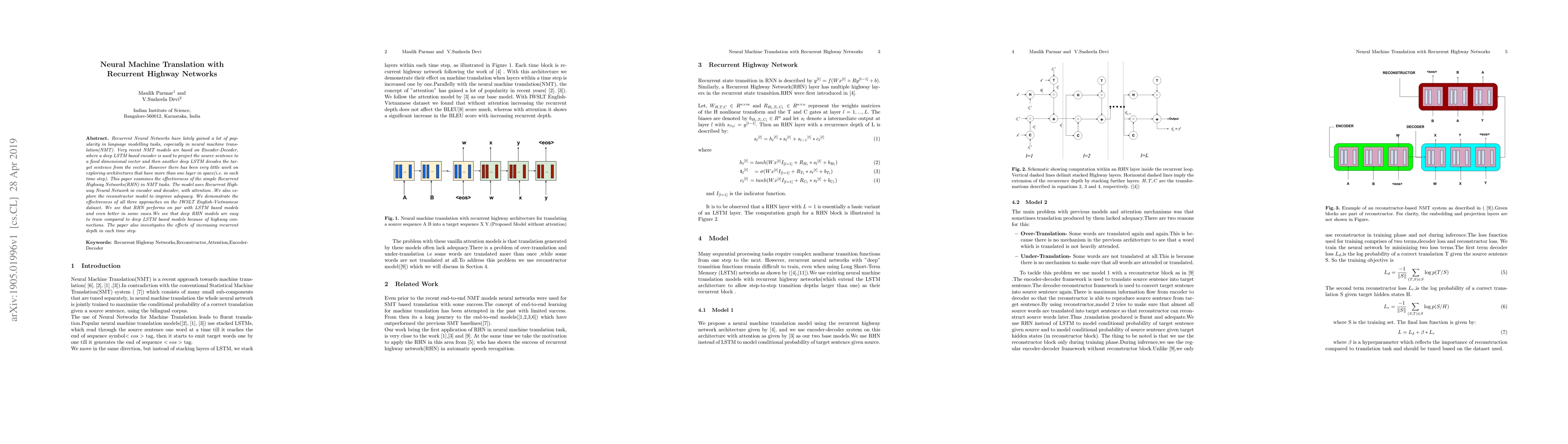 Recurrent Neural Networks have lately gained a lot of popularity in language modelling tasks, especially in neural machine translation(NMT). Very recent NMT models are based on Encoder-Decoder, where a deep LSTM based encoder is used to project the source sentence to a fixed dimensional vector and then another deep LSTM decodes the target sentence from the vector. However there has been very little work on exploring architectures that have more than one layer in space(i.e. in each time step). This paper examines the effectiveness of the simple Recurrent Highway Networks(RHN) in NMT tasks. The model uses Recurrent Highway Neural Network in encoder and decoder, with attention .We also explore the reconstructor model to improve adequacy. We demonstrate the effectiveness of all three approaches on the IWSLT English-Vietnamese dataset. We see that RHN performs on par with LSTM based models and even better in some cases.We see that deep RHN models are easy to train compared to deep LSTM based models because of highway connections. The paper also investigates the effects of increasing recurrent depth in each time step.