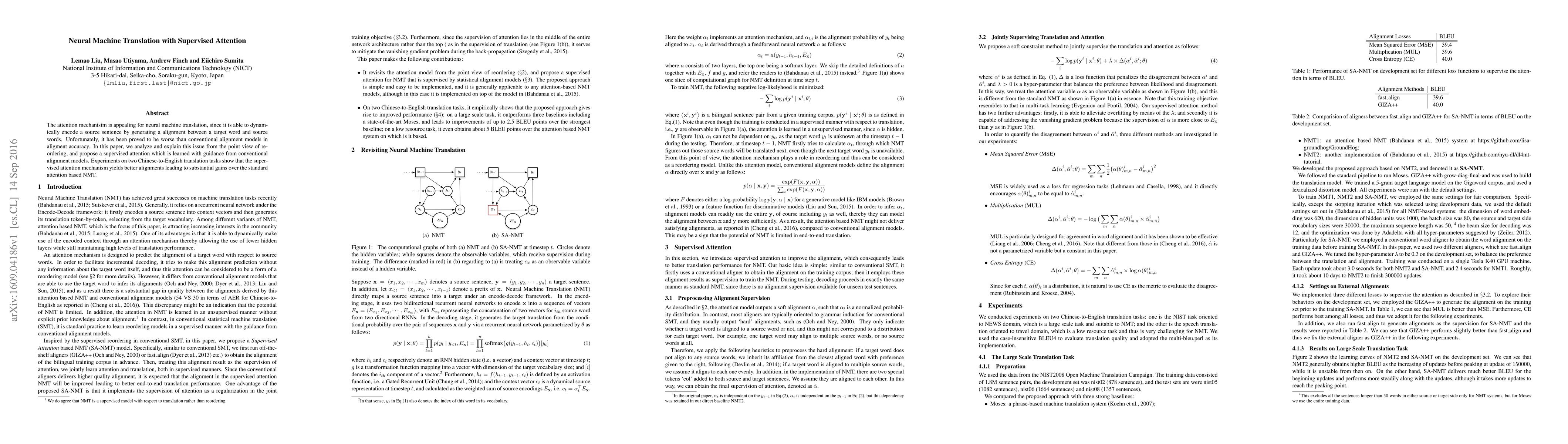 This paper proposes a supervised attention mechanism for neural machine translation that leverages guidance from conventional alignment models to improve alignment accuracy, leading to better translation performance compared to standard attention-based models. Experiments on Chinese-to-English translation tasks demonstrate significant gains using this approach.