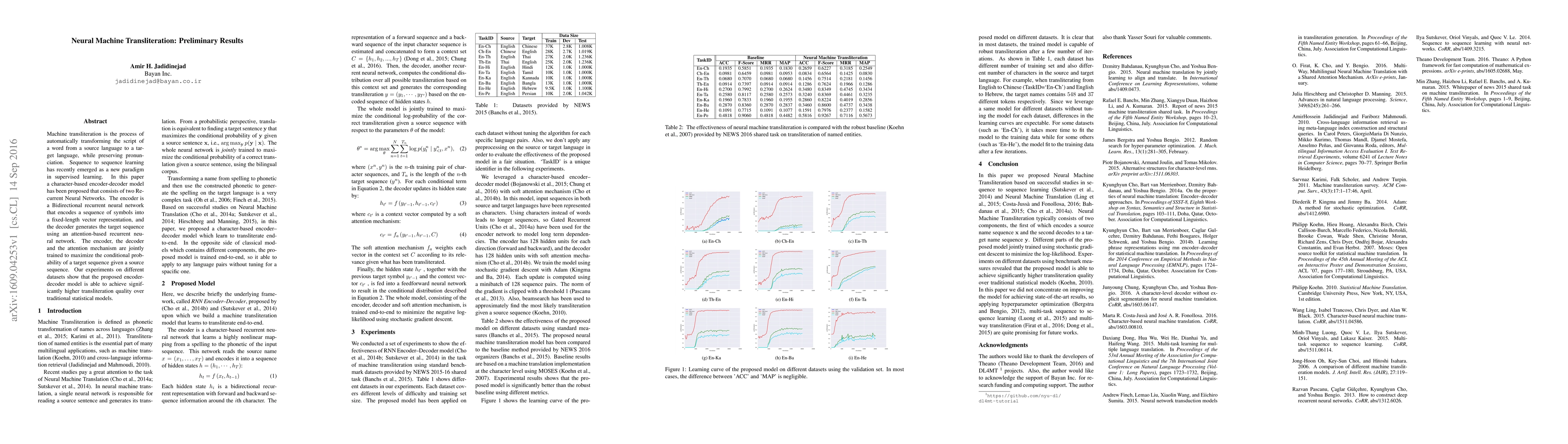 This paper proposes a character-based neural machine transliteration model using a bidirectional encoder and attention-based decoder, achieving higher transliteration quality compared to traditional statistical models, based on experiments across various datasets.