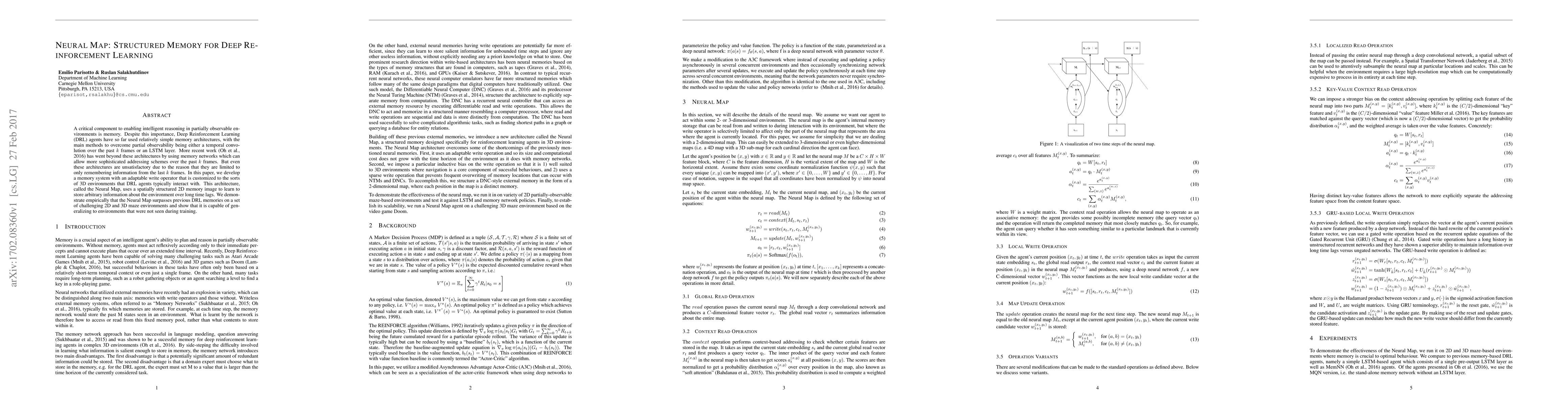 A critical component to enabling intelligent reasoning in partially observable environments is memory. Despite this importance, Deep Reinforcement Learning (DRL) agents have so far used relatively simple memory architectures, with the main methods to overcome partial observability being either a temporal convolution over the past k frames or an LSTM layer. More recent work (Oh et al., 2016) has went beyond these architectures by using memory networks which can allow more sophisticated addressing schemes over the past k frames. But even these architectures are unsatisfactory due to the reason that they are limited to only remembering information from the last k frames. In this paper, we develop a memory system with an adaptable write operator that is customized to the sorts of 3D environments that DRL agents typically interact with. This architecture, called the Neural Map, uses a spatially structured 2D memory image to learn to store arbitrary information about the environment over long time lags. We demonstrate empirically that the Neural Map surpasses previous DRL memories on a set of challenging 2D and 3D maze environments and show that it is capable of generalizing to environments that were not seen during training.
