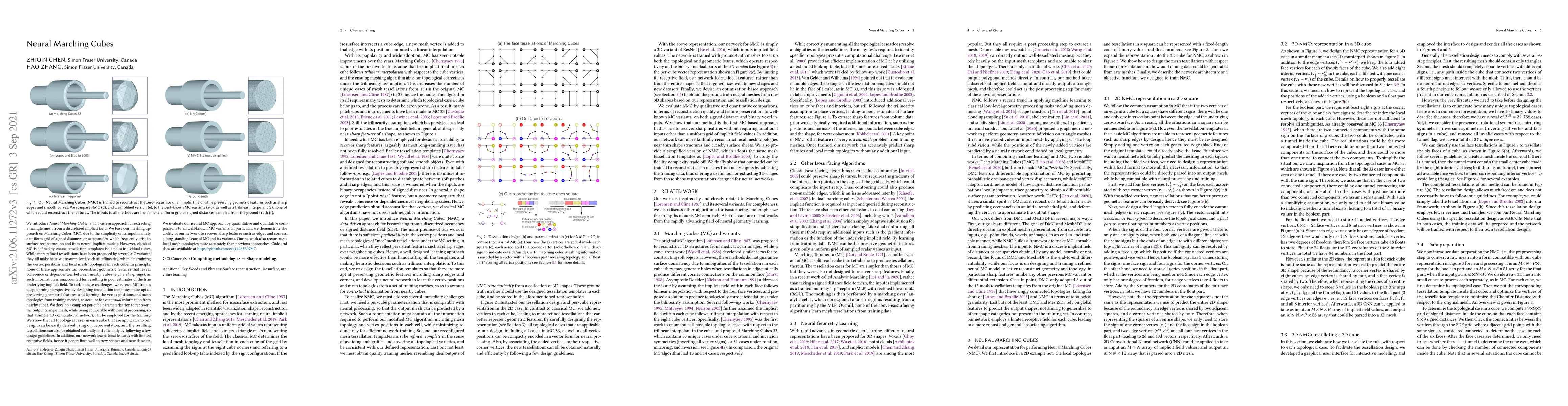 We introduce Neural Marching Cubes (NMC), a data-driven approach for extracting a triangle mesh from a discretized implicit field. Classical MC is defined by coarse tessellation templates isolated to individual cubes. While more refined tessellations have been proposed, they all make heuristic assumptions, such as trilinearity, when determining the vertex positions and local mesh topologies in each cube. In principle, none of these approaches can reconstruct geometric features that reveal coherence or dependencies between nearby cubes (e.g., a sharp edge), as such information is unaccounted for, resulting in poor estimates of the true underlying implicit field. To tackle these challenges, we re-cast MC from a deep learning perspective, by designing tessellation templates more apt at preserving geometric features, and learning the vertex positions and mesh topologies from training meshes, to account for contextual information from nearby cubes. We develop a compact per-cube parameterization to represent the output triangle mesh, while being compatible with neural processing, so that a simple 3D convolutional network can be employed for the training. We show that all topological cases in each cube that are applicable to our design can be easily derived using our representation, and the resulting tessellations can also be obtained naturally and efficiently by following a few design guidelines. In addition, our network learns local features with limited receptive fields, hence it generalizes well to new shapes and new datasets. We evaluate our neural MC approach by quantitative and qualitative comparisons to all well-known MC variants. In particular, we demonstrate the ability of our network to recover sharp features such as edges and corners, a long-standing issue of MC and its variants. Our network also reconstructs local mesh topologies more accurately than previous approaches.
