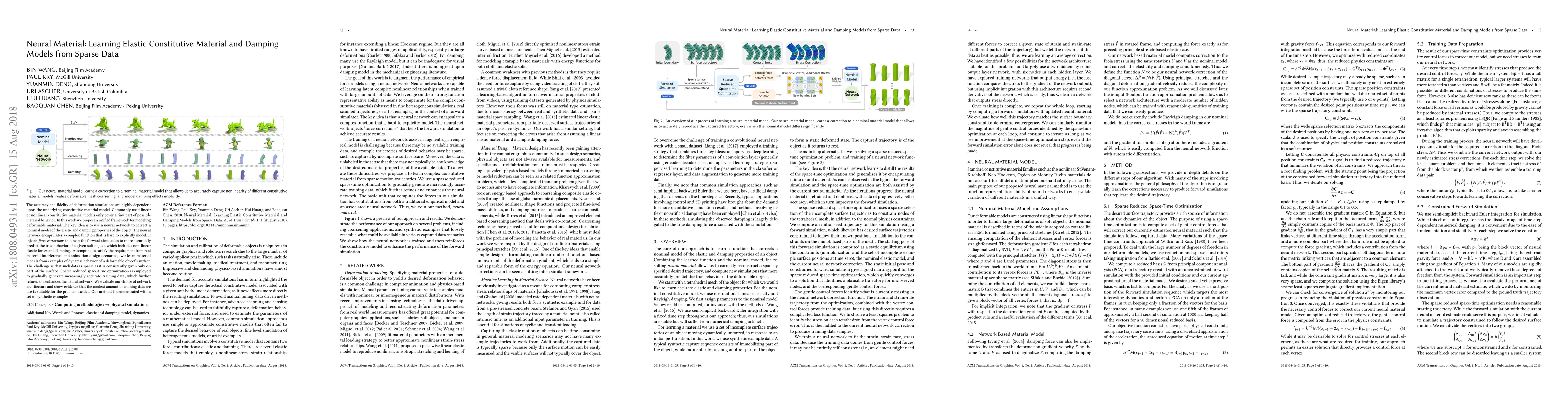The accuracy and fidelity of deformation simulations are highly dependent upon the underlying constitutive material model. Commonly used linear or nonlinear constitutive material models only cover a tiny part of possible material behavior. In this work we propose a unified framework for modeling deformable material. The key idea is to use a neural network to correct a nominal model of the elastic and damping properties of the object. The neural network encapsulates a complex function that is hard to explicitly model. It injects force corrections that help the forward simulation to more accurately predict the true behavior of a given soft object, which includes non-linear elastic forces and damping. Attempting to satisfy the requirement from real material interference and animation design scenarios, we learn material models from examples of dynamic behavior of a deformable object's surface. The challenge is that such data is sparse as it is consistently given only on part of the surface. Sparse reduced space-time optimization is employed to gradually generate increasingly accurate training data, which further refines and enhances the neural network. We evaluate our choice of network architecture and show evidence that the modest amount of training data we use is suitable for the problem tackled. Our method is demonstrated with a set of synthetic examples.