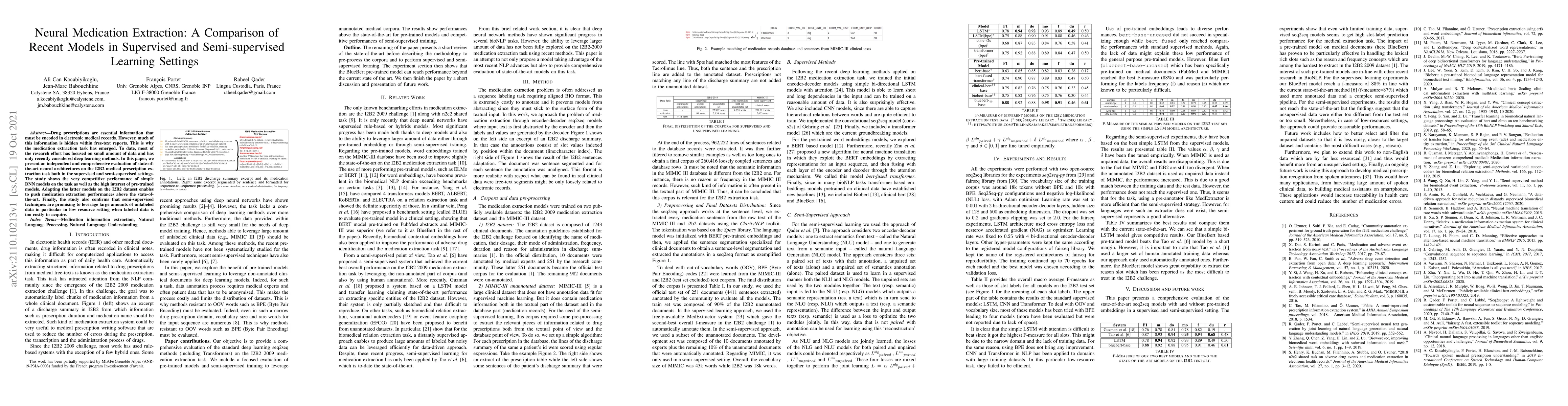 This paper evaluates state-of-the-art neural architectures for medication extraction from free-text reports, comparing supervised and semi-supervised learning. Simple DNN models and pre-trained models show competitive performance, with the latter significantly improving results when adapted to the I2B2 dataset, highlighting the potential of semi-supervised techniques in low-resource settings.