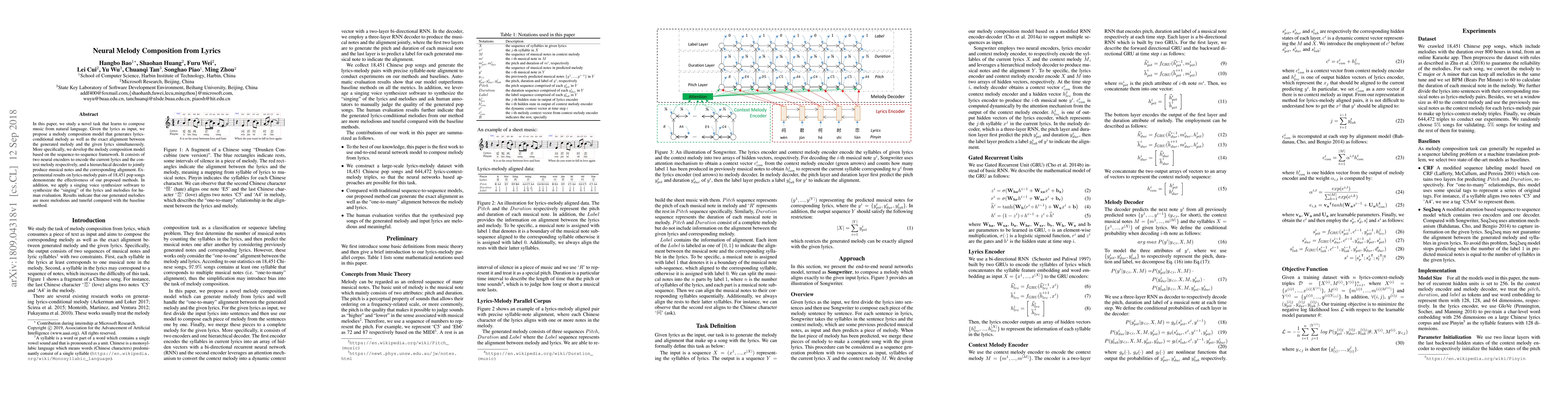 This paper proposes a neural model for composing melodies from lyrics using a sequence-to-sequence framework, generating both melodies and their alignment with lyrics. Experimental results show that the generated melodies are more melodic compared to baseline methods, as evaluated by human listeners.