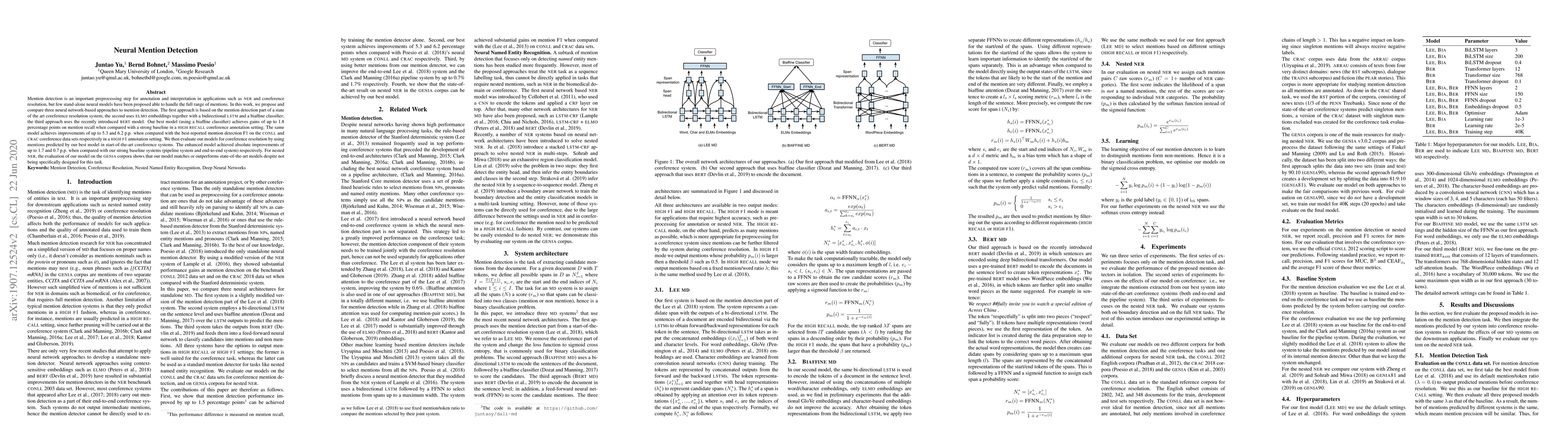 Mention detection is an important preprocessing step for annotation and interpretation in applications such as NER and coreference resolution, but few stand-alone neural models have been proposed able to handle the full range of mentions. In this work, we propose and compare three neural network-based approaches to mention detection. The first approach is based on the mention detection part of a state of the art coreference resolution system; the second uses ELMO embeddings together with a bidirectional LSTM and a biaffine classifier; the third approach uses the recently introduced BERT model. Our best model (using a biaffine classifier) achieves gains of up to 1.8 percentage points on mention recall when compared with a strong baseline in a HIGH RECALL coreference annotation setting. The same model achieves improvements of up to 5.3 and 6.2 p.p. when compared with the best-reported mention detection F1 on the CONLL and CRAC coreference data sets respectively in a HIGH F1 annotation setting. We then evaluate our models for coreference resolution by using mentions predicted by our best model in start-of-the-art coreference systems. The enhanced model achieved absolute improvements of up to 1.7 and 0.7 p.p. when compared with our strong baseline systems (pipeline system and end-to-end system) respectively. For nested NER, the evaluation of our model on the GENIA corpora shows that our model matches or outperforms state-of-the-art models despite not being specifically designed for this task.
