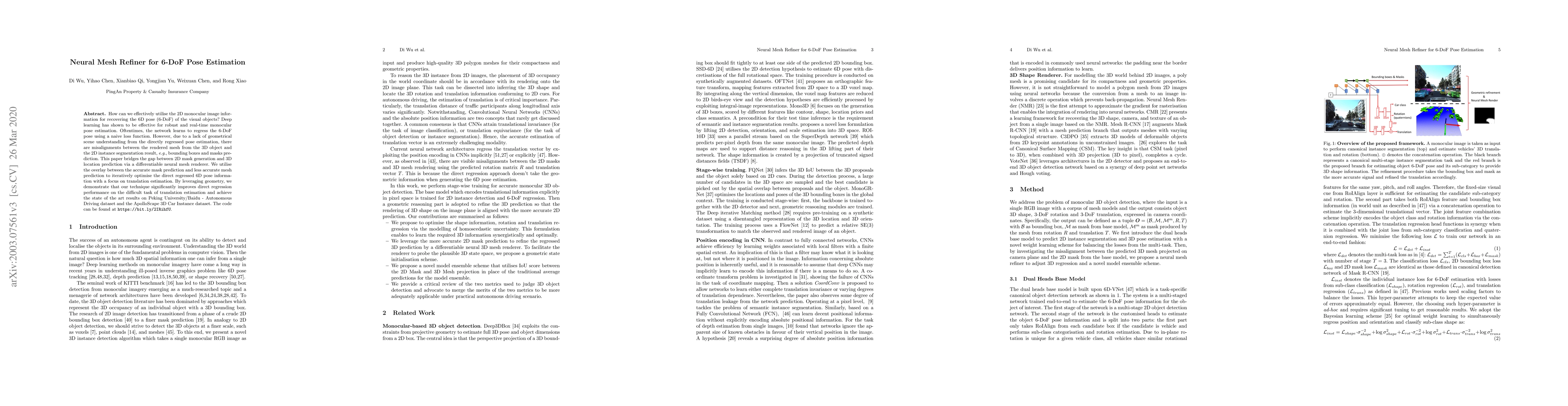 This paper proposes a Neural Mesh Refiner to enhance 6-DoF pose estimation from monocular images by iteratively optimizing the direct regressed pose using a differentiable neural mesh renderer. The method significantly improves translation estimation and achieves state-of-the-art results on autonomous driving datasets.