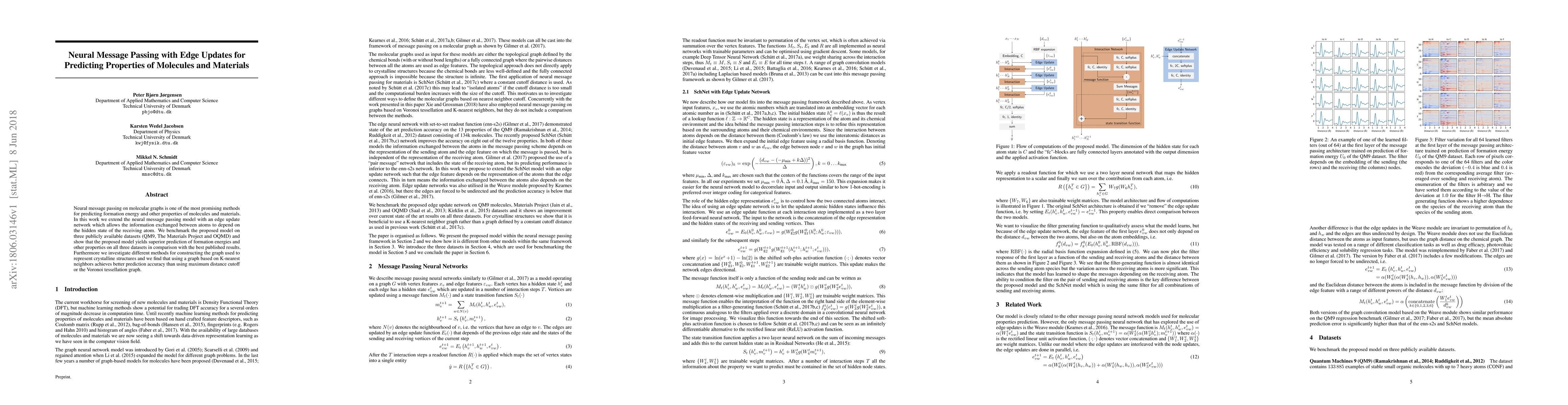Neural message passing on molecular graphs is one of the most promising methods for predicting formation energy and other properties of molecules and materials. In this work we extend the neural message passing model with an edge update network which allows the information exchanged between atoms to depend on the hidden state of the receiving atom. We benchmark the proposed model on three publicly available datasets (QM9, The Materials Project and OQMD) and show that the proposed model yields superior prediction of formation energies and other properties on all three datasets in comparison with the best published results. Furthermore we investigate different methods for constructing the graph used to represent crystalline structures and we find that using a graph based on K-nearest neighbors achieves better prediction accuracy than using maximum distance cutoff or the Voronoi tessellation graph.