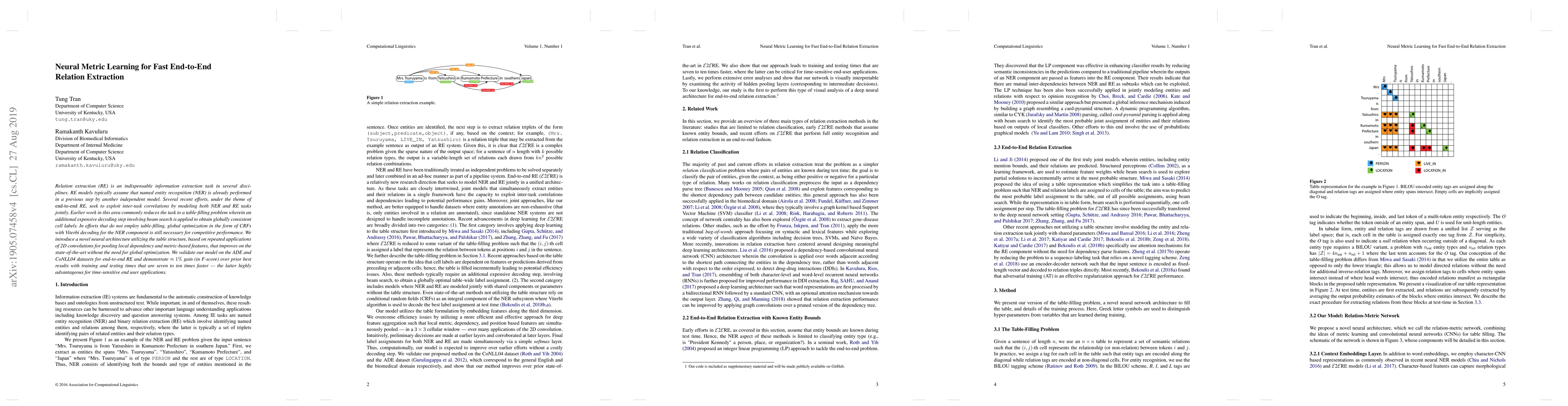 This paper proposes a novel neural metric learning architecture for fast end-to-end relation extraction, achieving a $\approx 1\%$ gain in F-score over previous methods without requiring global optimization, and significantly reducing training and testing times.