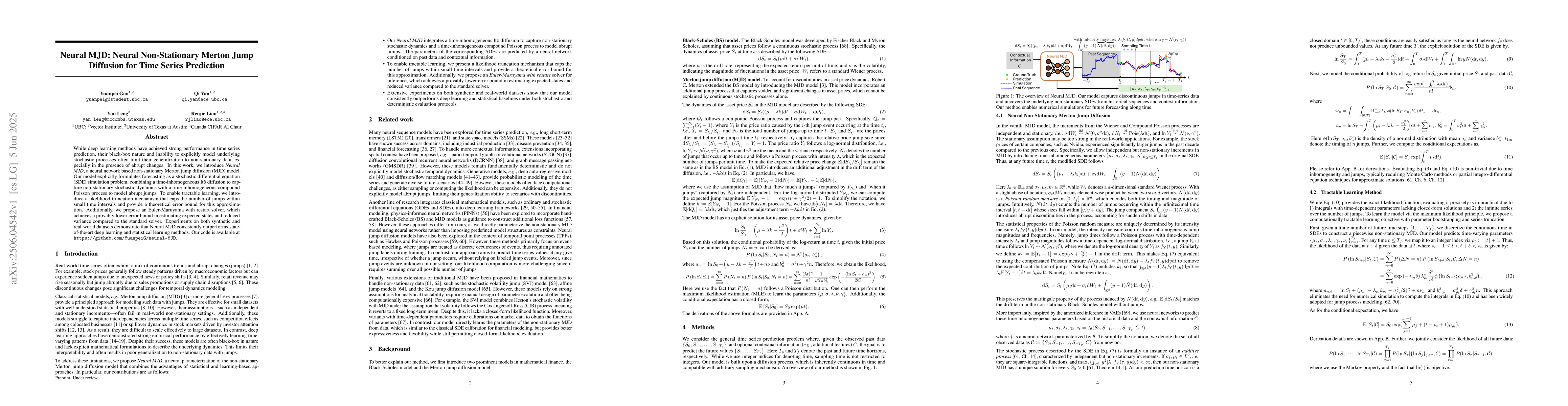 The research introduces Neural MJD, a neural network-based non-stationary Merton jump diffusion (MJD) model that formulates forecasting as an SDE simulation problem, combining a time-inhomogeneous Itô diffusion for non-stationary stochastic dynamics with a time-inhomogeneous compound Poisson process for abrupt jumps. Likelihood truncation and an Euler-Maruyama with restart solver are proposed for tractable learning and error bound reduction.