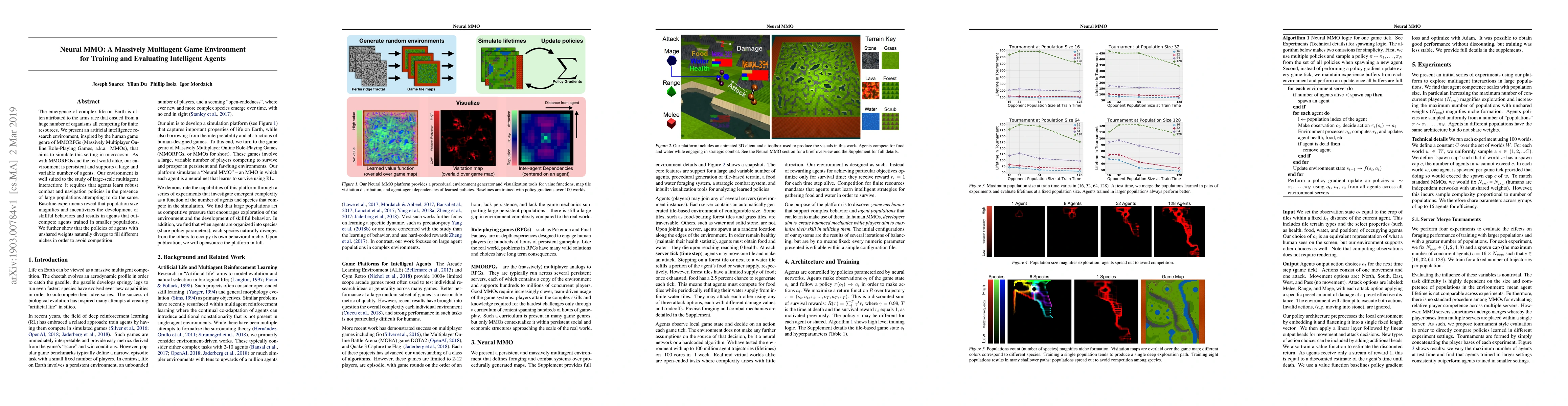The emergence of complex life on Earth is often attributed to the arms race that ensued from a huge number of organisms all competing for finite resources. We present an artificial intelligence research environment, inspired by the human game genre of MMORPGs (Massively Multiplayer Online Role-Playing Games, a.k.a. MMOs), that aims to simulate this setting in microcosm. As with MMORPGs and the real world alike, our environment is persistent and supports a large and variable number of agents. Our environment is well suited to the study of large-scale multiagent interaction: it requires that agents learn robust combat and navigation policies in the presence of large populations attempting to do the same. Baseline experiments reveal that population size magnifies and incentivizes the development of skillful behaviors and results in agents that outcompete agents trained in smaller populations. We further show that the policies of agents with unshared weights naturally diverge to fill different niches in order to avoid competition.