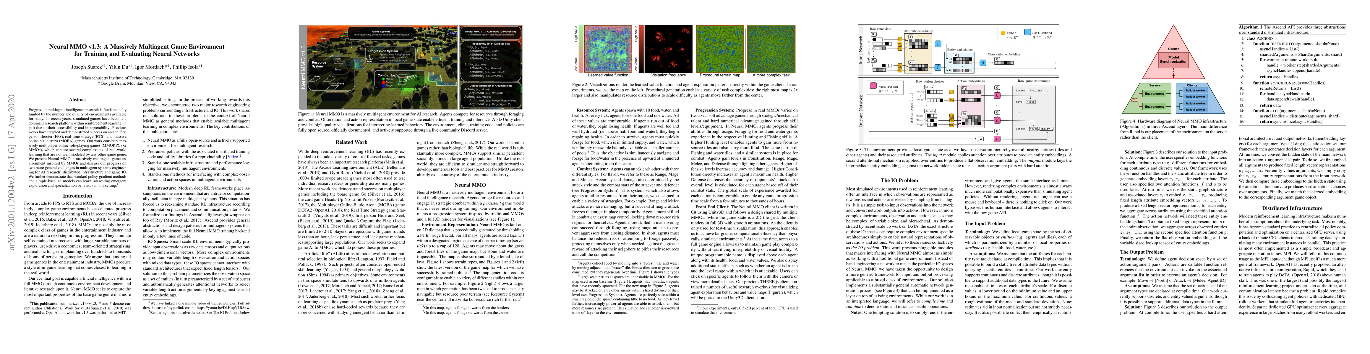 Neural MMO v1.3 introduces a new massively multiagent game environment for training and evaluating neural networks, addressing the complexities of real-world learning not captured by other game genres. The paper also tackles challenges in distributed infrastructure and game IO, showcasing emergent behaviors learned by standard policy gradient methods.