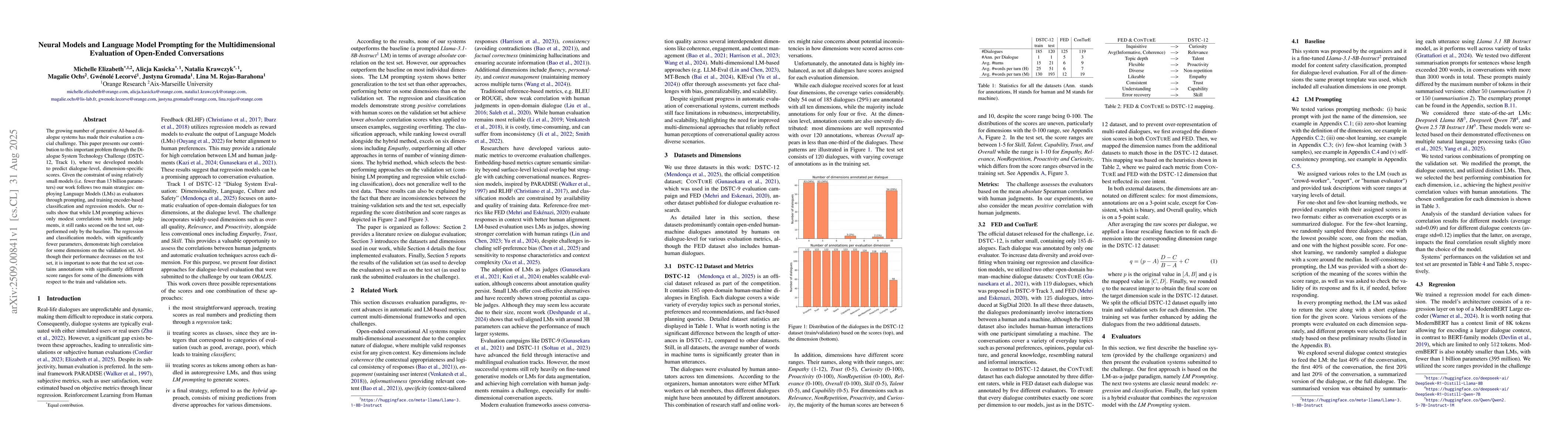 The growing number of generative AI-based dialogue systems has made their evaluation a crucial challenge. This paper presents our contribution to this important problem through the Dialogue System Technology Challenge (DSTC-12, Track 1), where we developed models to predict dialogue-level, dimension-specific scores. Given the constraint of using relatively small models (i.e. fewer than 13 billion parameters) our work follows two main strategies: employing Language Models (LMs) as evaluators through prompting, and training encoder-based classification and regression models. Our results show that while LM prompting achieves only modest correlations with human judgments, it still ranks second on the test set, outperformed only by the baseline. The regression and classification models, with significantly fewer parameters, demonstrate high correlation for some dimensions on the validation set. Although their performance decreases on the test set, it is important to note that the test set contains annotations with significantly different score ranges for some of the dimensions with respect to the train and validation sets.