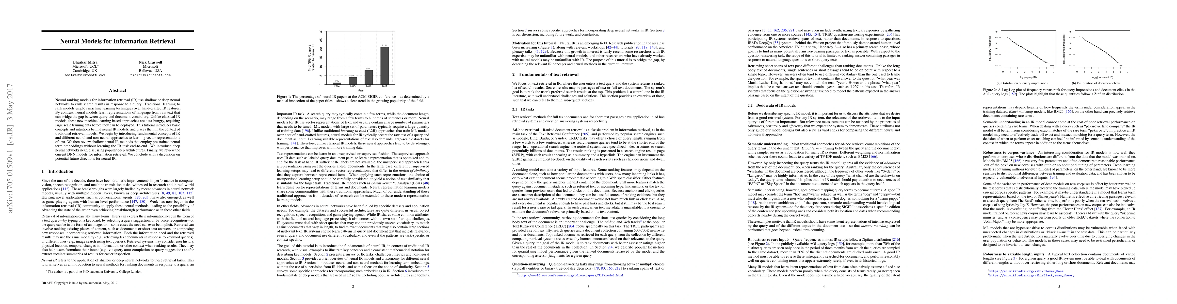 This paper provides a comprehensive overview of neural models for information retrieval, contrasting them with traditional machine learning approaches. It discusses the use of neural networks to learn representations from raw text, highlighting the data-intensive nature of these models and reviewing both shallow and deep neural methods for ranking search results.