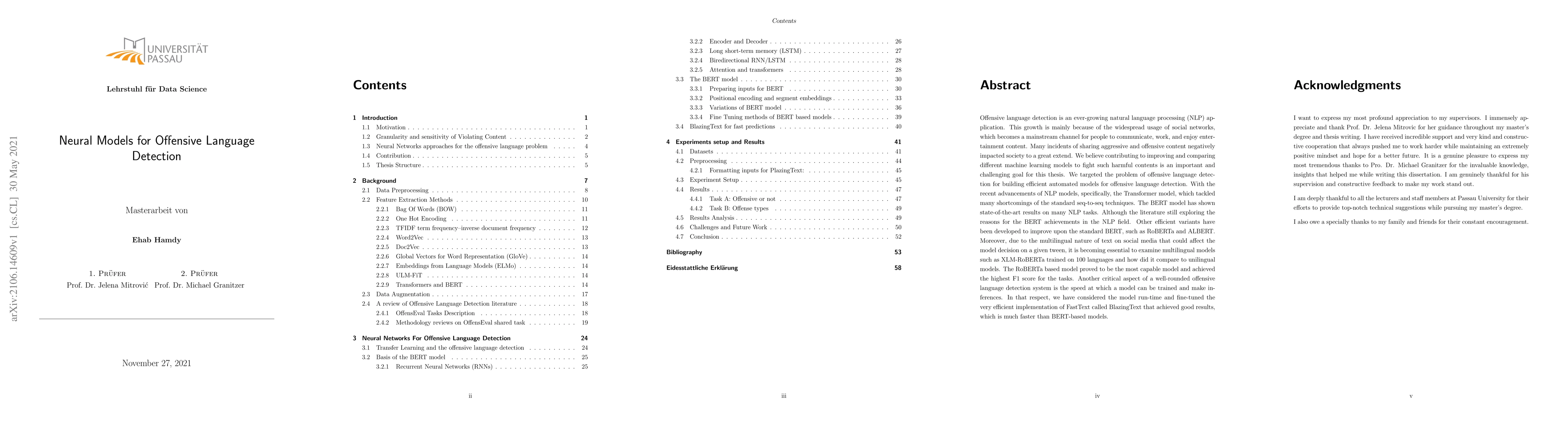 This paper investigates neural models for detecting offensive language in social media, focusing on comparing the performance of various Transformer-based models like BERT, RoBERTa, and ALBERT, and their multilingual variant XLM-RoBERTa. The RoBERTa-based model showed the best results, while the BlazingText variant provided a faster, efficient alternative.