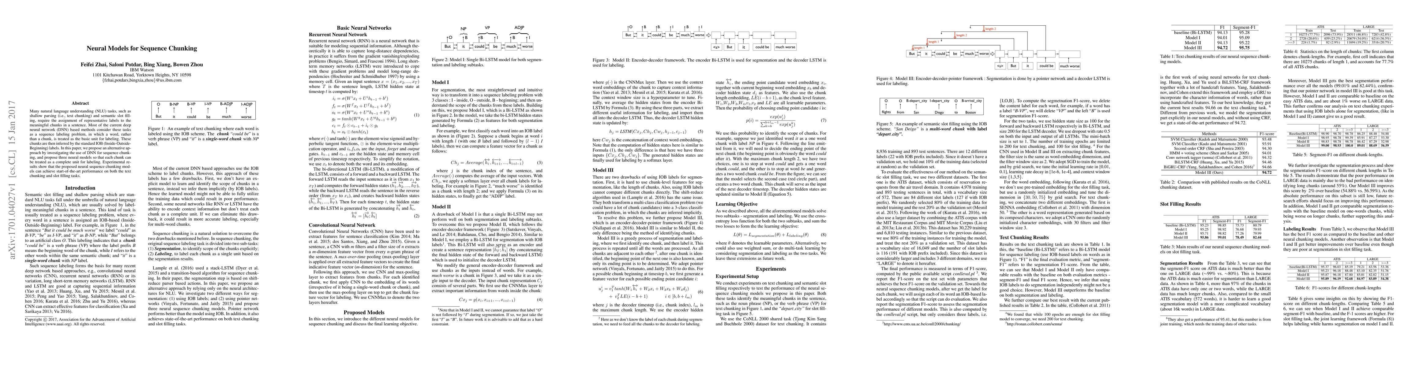 This paper proposes neural models for sequence chunking in natural language understanding, treating chunks as complete units for labeling instead of individual words. The proposed models achieve state-of-the-art performance in text chunking and semantic slot filling tasks.