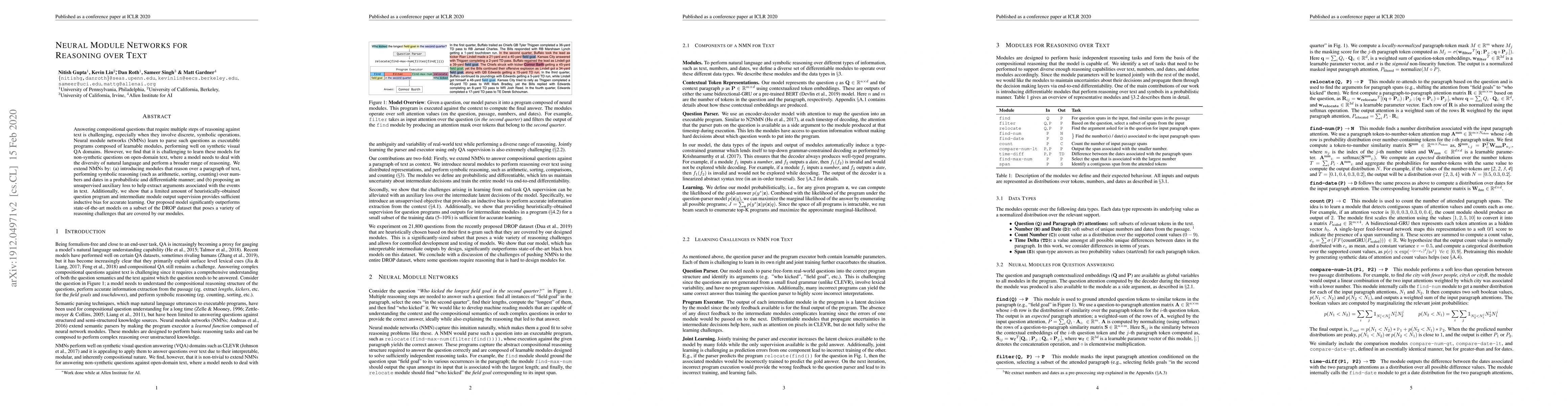 This paper proposes an extension of Neural Module Networks (NMNs) to tackle complex reasoning over open-domain text, introducing modules capable of symbolic reasoning and an unsupervised auxiliary loss for argument extraction. The model achieves superior performance on a challenging subset of the DROP dataset.