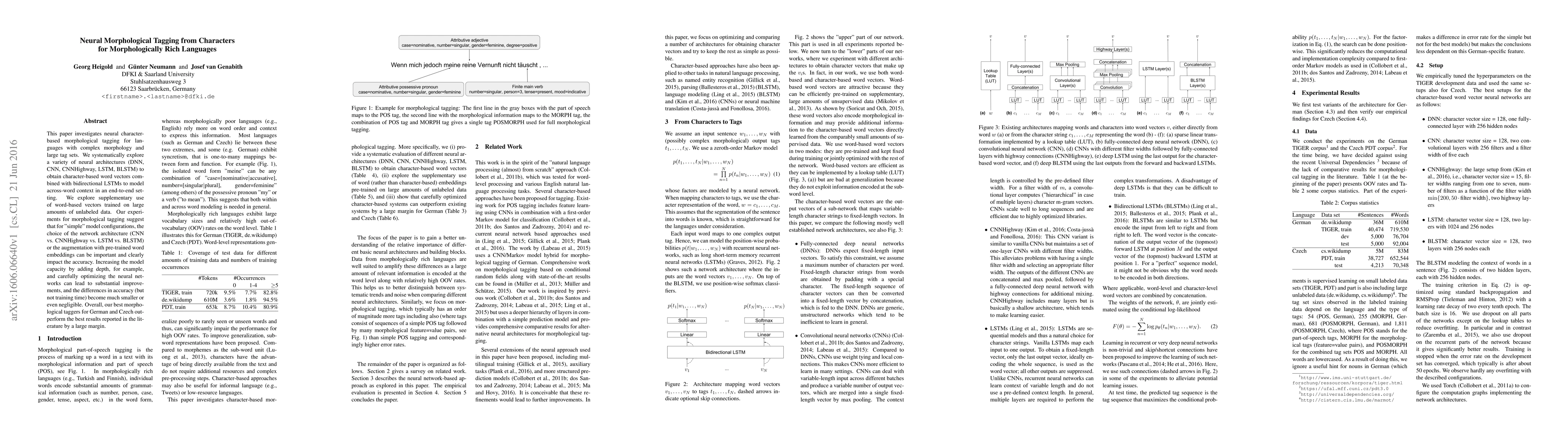 This paper explores neural character-based morphological tagging for morphologically rich languages using various neural architectures, finding that model complexity and optimization significantly impact tagging accuracy, with the best models outperforming previous results for German and Czech.